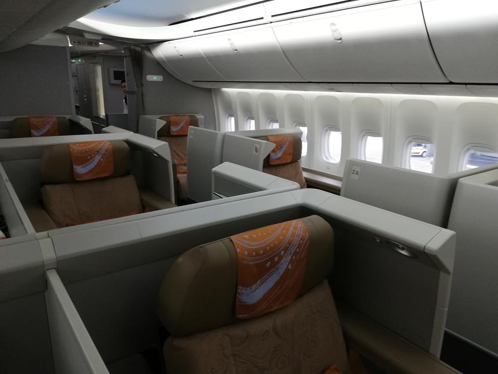 Die 12 Sitze sind als halb offene Suiten gestaltet. Das heißt um den Sitz ist eine Trennwand zum Gang, die in etwa brusthoch ist.