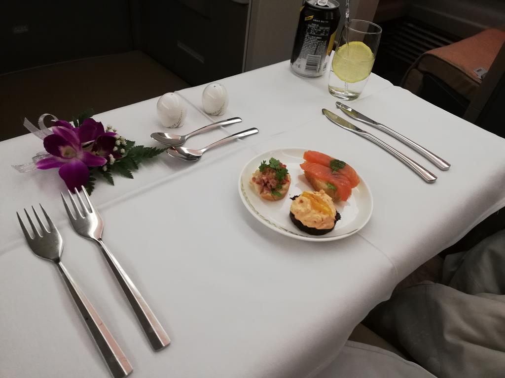 Als Vorspeise konnte man sich verschiedene Canpés aussuchen. Im Anschluss wurde uns der Kaviar präsentiert. Diesen mussten wir leider beide überspringen, da wir auf Meeresfrüchte allergisch sind. Man sollte noch anmerken, dass der Tisch wirklich akkurat und vor allem schön eingedeckt wurde.