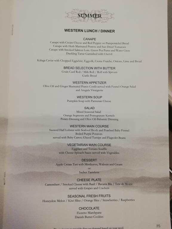 Die Speisekarten lagen bereits am Platz und man wollte direkt die Bestellungen aufnehmen. Die Crew war sehr aufmerksam und wollte alles perfekt machen. Allerdings war es manchmal zu viel des Guten. Ohne dass wir in die Karte geschaut hatten wollte man sofort das Menü besprechen und sogar das Frühstück zusammenstellen. Wir hätten uns hier ein wenig Ruhe und Bedenkzeit gewünscht.