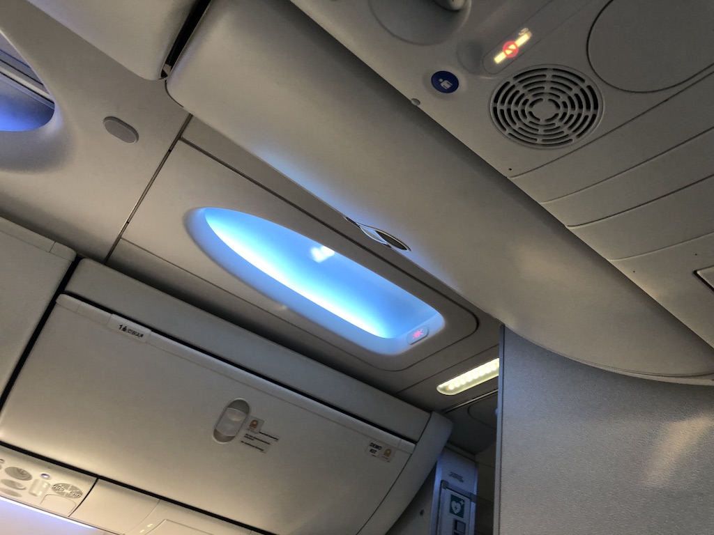 Das knapp zehn Jahre alte Flugzeug war in der Kabine an einigen Stellen abgenutzt, machte aber einen ordentlichen und sauberen ersten Eindruck. Sobald die Handgepäckfächer geschlossen werden, entsteht ein gutes Raumgefühl. Die moderne indirekte Beleuchtung sorgt für eine angenehme Atmosphäre. In dem Flugzeug gab es sogar noch Monitore, die für das Safety-Video und die Flugroute genutzt wurden.
