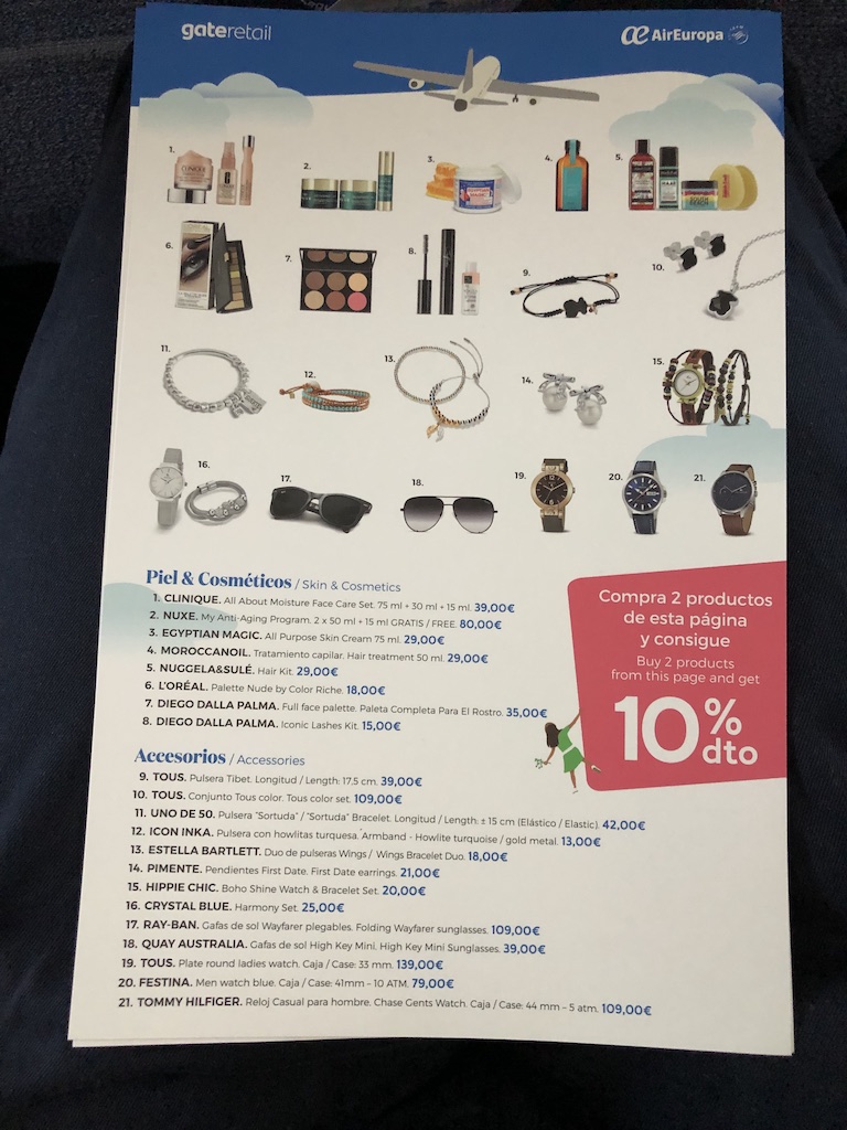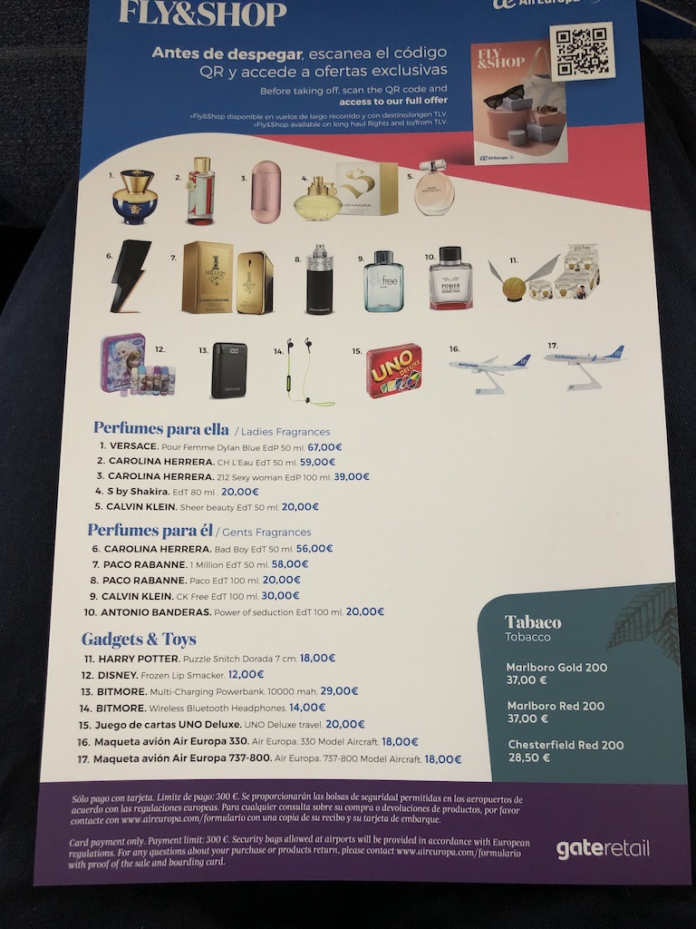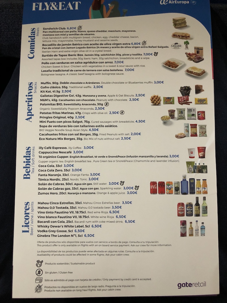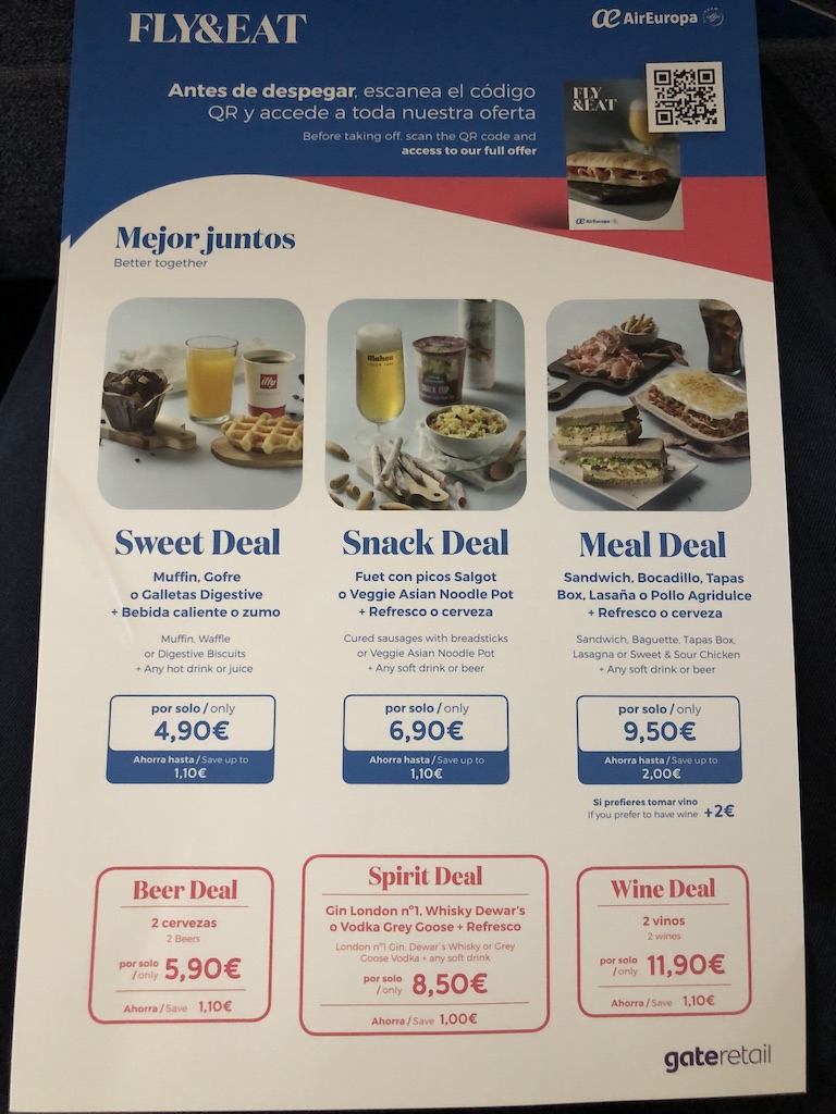 Neben den üblichen Getränken und Snacks gibt es auch einige Paketangebote. Eine weitere Karte zeigt das Duty Free-Angebot, dieses war auf dem kurzen Flug aber nicht verfügbar.