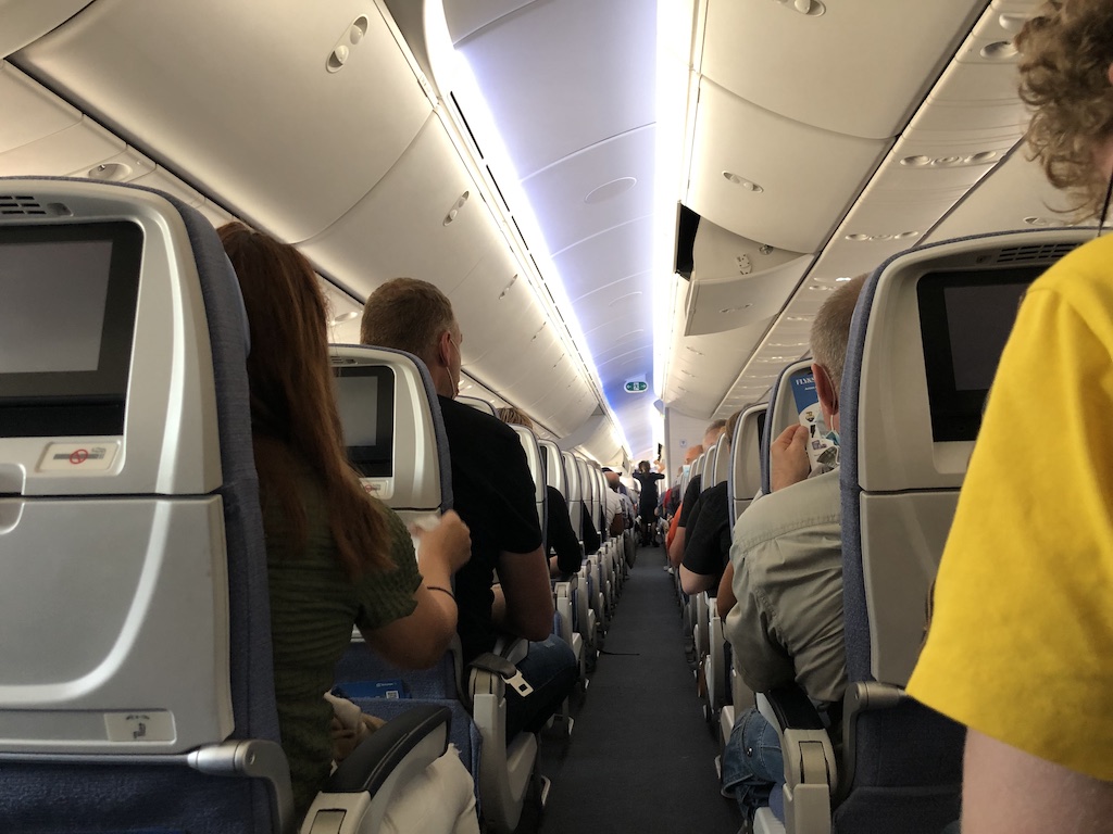 Beim Einsteigen erwartete uns eine motivierte Crew, alle Gäste erhielten ein Desinfektionstuch. Noch am Boden wurden viele Passagiere auf das korrekte Tragen der Maske hingewiesen. Während das Sicherheitsvideo lief, zeigten die Flugbegleiter parallel die Notausgänge und bereiteten die Kabine für den Start vor.