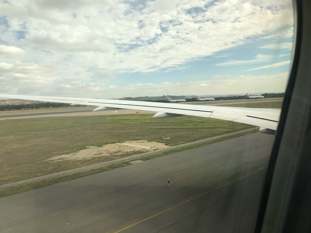 In Madrid angekommen rollten wir eine gefühlte Ewigkeit zu der Parkposition. Im Hintergrund konnte man mehrere Airbus A380 der British Airways erkennen, die dort geparkt sind. An der Außenposition warteten Busse, die uns dann zum Terminal brachten.