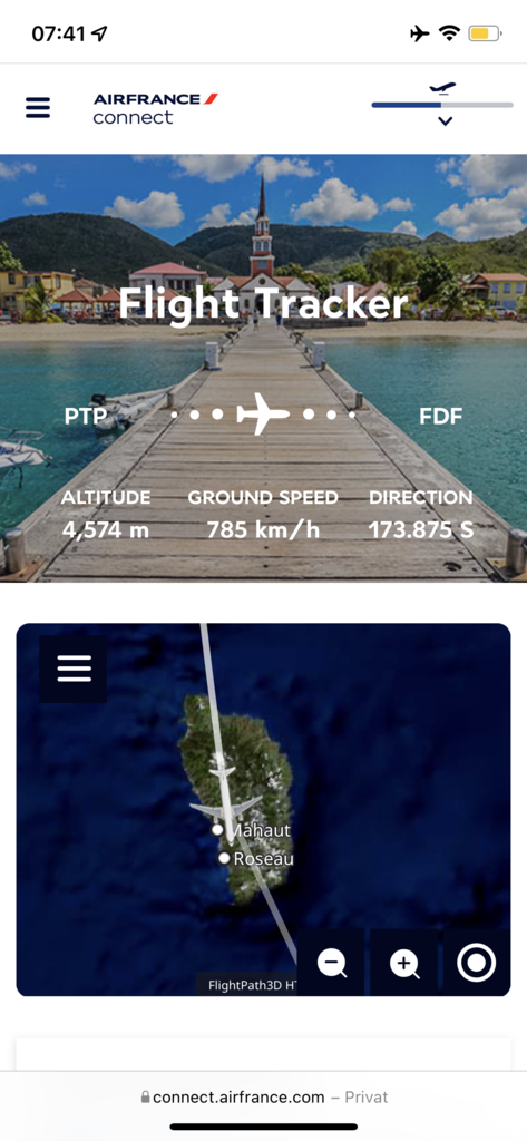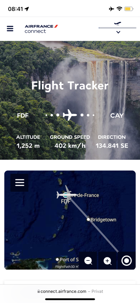 Das Boarding begann mit leichter Verspätung, war jedoch vorzeitig abgeschlossen. Kurz vor der angegebenen Flugzeit waren wir schon auf dem Weg nach Fort de France auf Martinique.