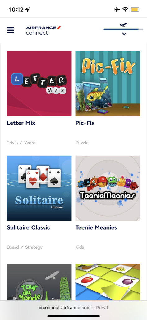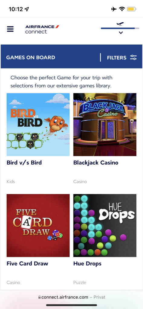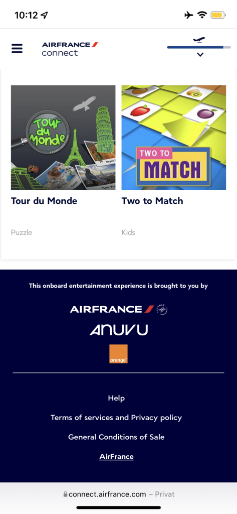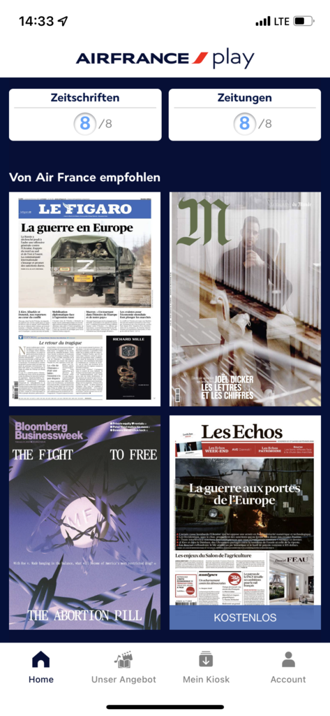 Es gibt außer dem Bordmagazin kein Entertainment an Bord. Hier kann es sich lohnen, Filme/Serien auf einem Gerät zu speichern und dann während des Fluges zu gucken. Über Air France Play können vorab Magazine und Zeitschriften auf ein Smartphone oder Tablett geladen werden.