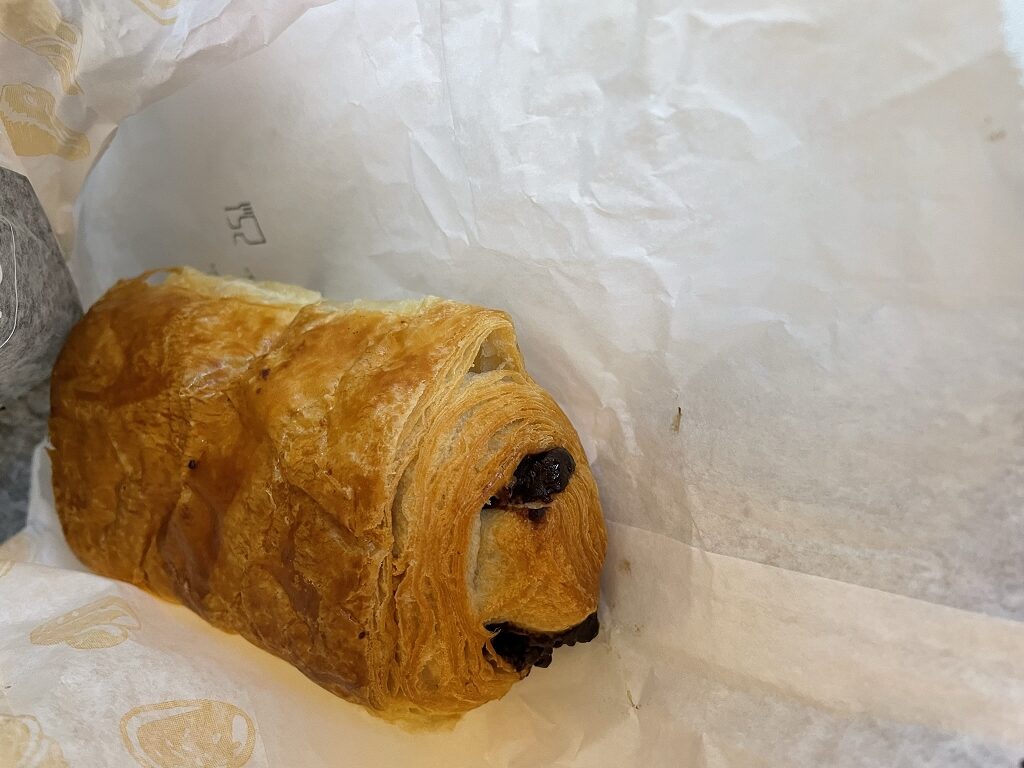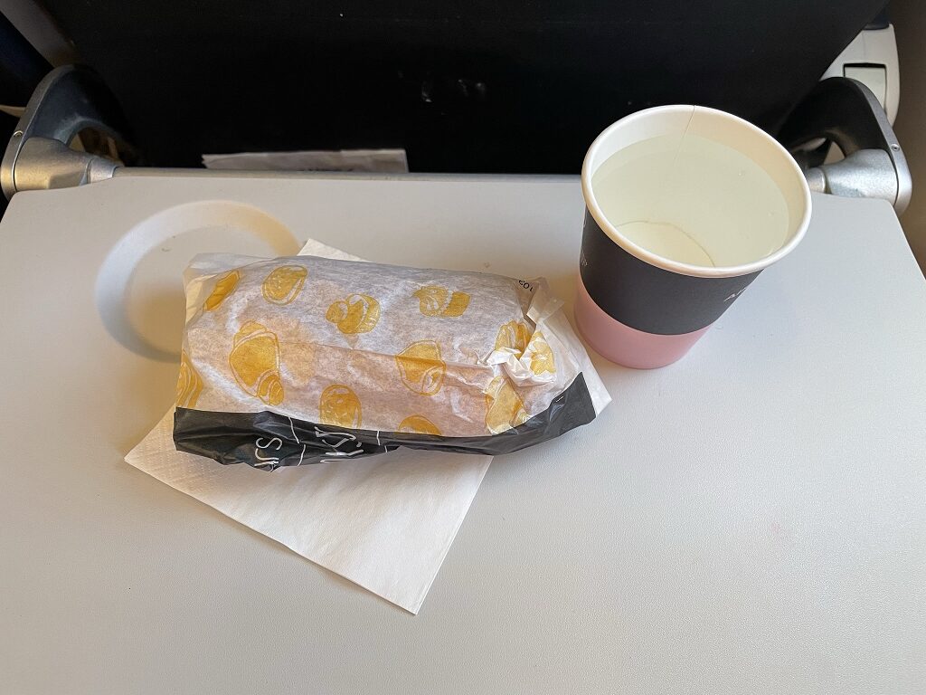 Zum Essen gab es ein Schokoladencroissant in einer Papiertüte und die Getränkeauswahl bestand aus Wasser, Säften, Softdrinks und warmen Getränken. Man durfte ein warmes und ein kaltes Getränk bestellen. Mit gerade einmal 100-150ml war das Kaltgetränk nicht gerade großzügig dimensioniert. Für einen Flug von ca. 4 Stunden Dauer ist das schon sehr wenig.