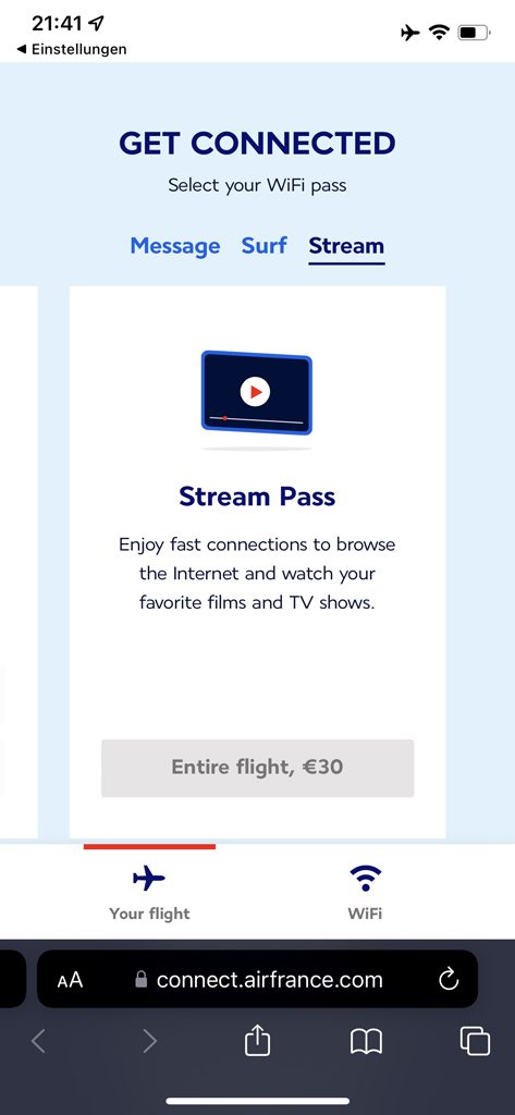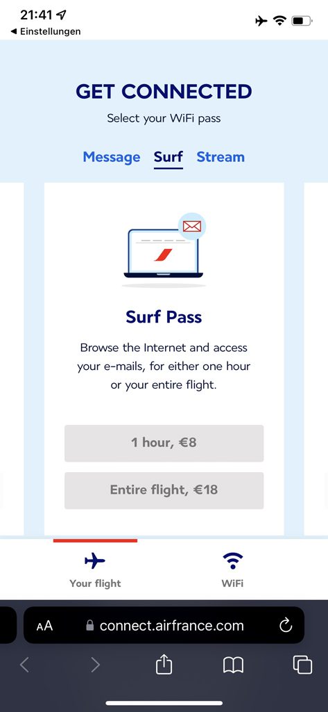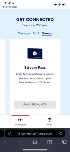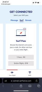 Der Surf Pass für eine Stunde kosten 8 Euro, für den ganzen Flug kostet er 18 Euro. Wer schnelles Internet zum Streamen benötigt, kann das für 30 Euro für die Dauer des Fluges erwerben.