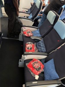 Beim letzten Blick in die App war der Platz neben meinem noch frei und im Mittelblock waren sogar noch zwei Sitze frei. Das lag gar nicht einmal daran, dass das Flugzeug nur wenige Passagiere hatte, sondern eher daran, dass alle unbedingt vorne sitzen wollten. So gab es hinten in der Economy Class dann ein paar freie Plätze.