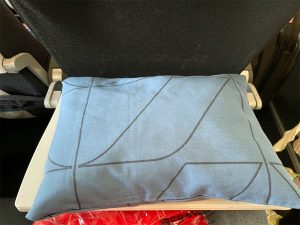 Der Sitzabstand liegt bei 31 Zoll (ca. 79cm) und die Sitzbreite ist mit 44cm ebenfalls in Ordnung. Die Kopfstützen haben die Farben grau, hellblau und dunkelblau. Ihre Anordnung wechselt andauernd, so dass die Kabine etwas verspielt wirkt.