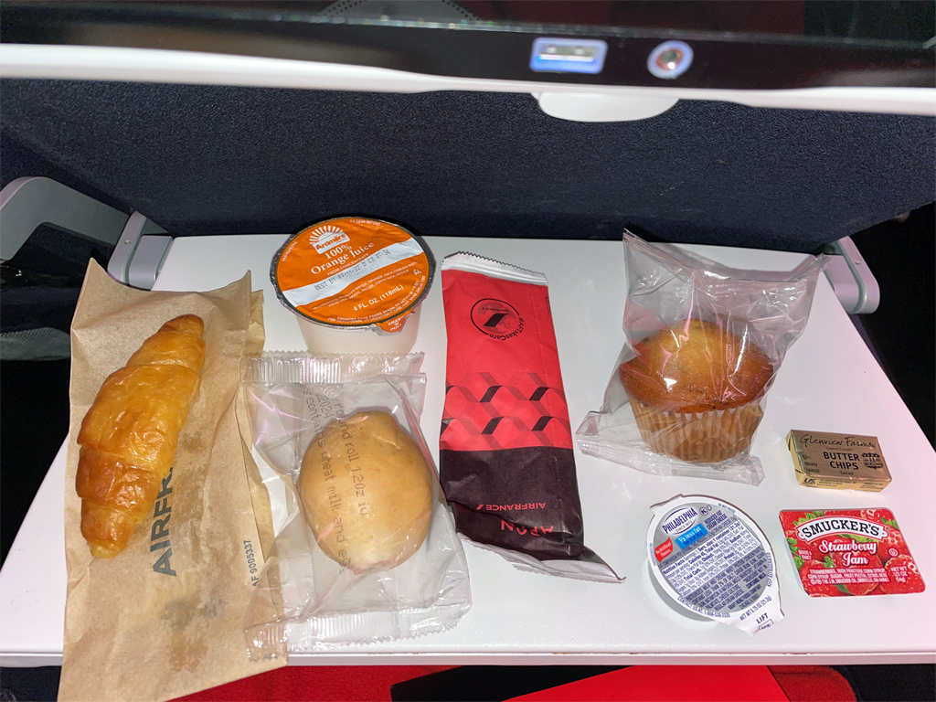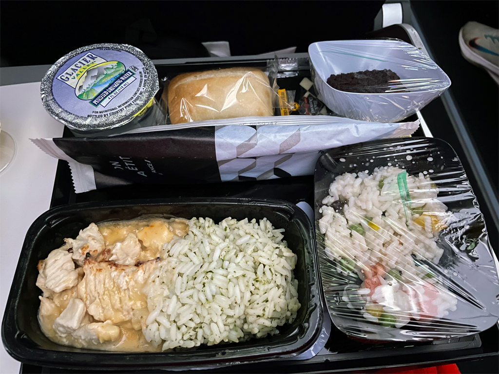 Der erste Service begann ca. 45 Minuten nach dem Start in Atlanta. Es gab ein warmes Abendessen, wobei die Wahl zwischen einem Gericht mit Fleisch und einer vegetarischen Mahlzeit bestand. Ich entschied mich für das Hühnchen. Das genoss ich mit einem (Plastik-)Glas Champagner und einem (Papp-)becher Perrier. Das Essen war wirklich lecker, da gibt es in der Economy Class oft Schlechteres.