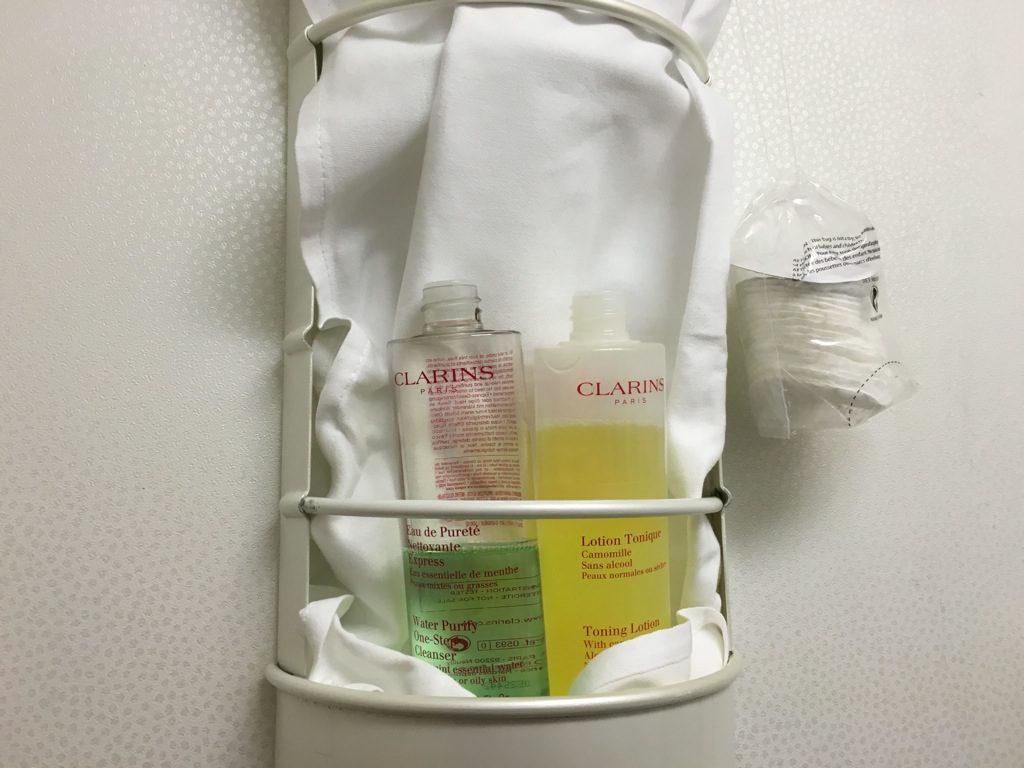 Im Badezimmer standen einige Amenitys von Clarins. Allerdings waren diese bei weitem nicht so umfangreich, wie zum Beispiel bei Singapore Airlines, sodass man auf ein Amenity Kit komplett verzichten kann. Auf längeren Flügen bietet Air France übrigens ein Amenity Kit in der Business Class an. Auf diesem kurzen Flug nach Jakarta scheint man dieses allerdings eingespart zu haben. Als ich diesen Flug vor 2 Jahren geflogen bin, wurden noch Amenity Kits auf der Singapur- Jakarta Strecke verteilt.