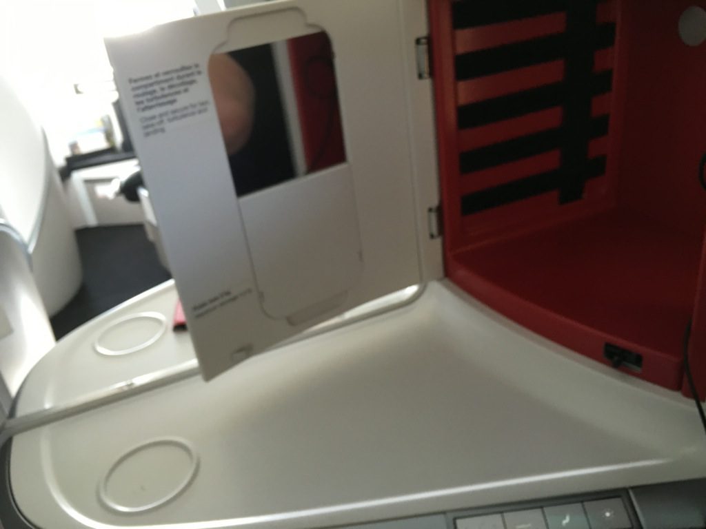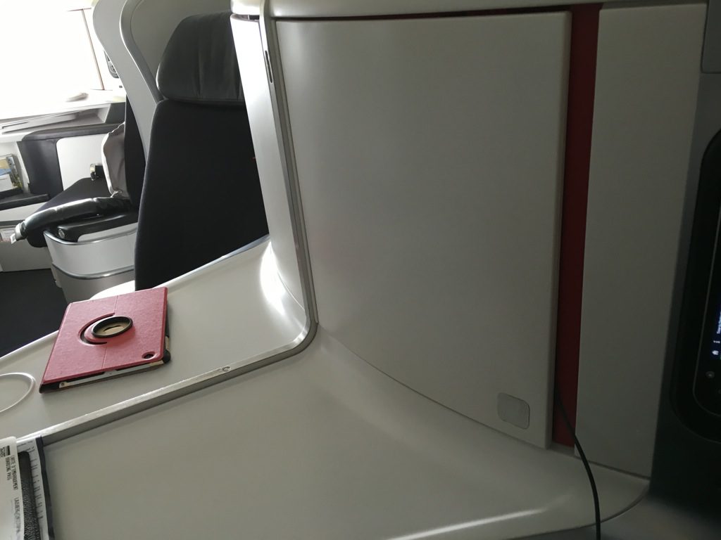 Der Sitz hat jede Menge Stauraum und Ablagen. Neben der großen Ablage zwischen den Sitzen, befindet sich ein Fach mit Schminkspiegel, in welchem auch die Kopfhörer untergebracht sind. Neben dem Sitz befindet sich noch eine Literaturtasche, eine Flasche Wasser sowie eine Steckdose und ein USB Anschluss zum Laden der mitgebrachten elektronischen Geräte.