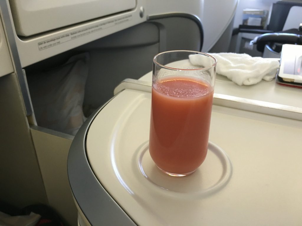 Nachdem wir unsere Sitzplätze eingenommen haben und unsere Jacken aufgehängt wurden, ging eine Flugbegleiterin mit einem Tablett mit Welcomedrinks durch die Kabine. Dabei bot sie Wasser, Champagner und Guavensaft an.