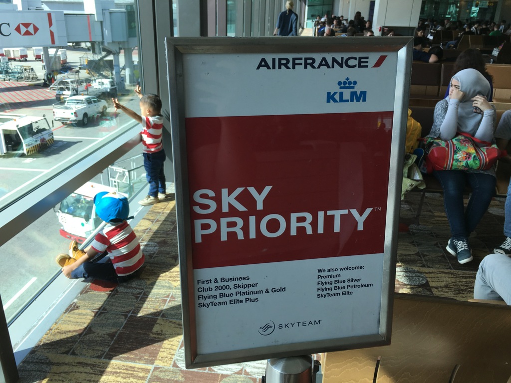 Am Flughafen Changi in Singapur findet die Sicherheitskontrolle immer vor dem Gate statt. Daher hat man vor dem Gate eine große holdingarea, in welcher sich alle Passagiere, welche die Sicherheitskontrolle schon durchlaufen haben aufhalten. KLM und Air France bieten am Gate einen eigenen Wartebereich für First und Business Class Passagiere, sowie SkyTeam ElitePlus Mitglieder an. Diesen erreicht man über einen abgesperrten Gang am Fenster und kann so direkt vor dem Gate warten und als einer der ersten Passagiere einsteigen. Hierdurch funktioniert das Priority Boarding ganz hervorragend.