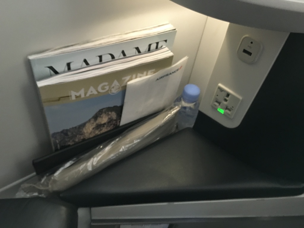 Was mir sehr positiv aufgefallen ist, sind die nützlichen Details am neuem Air France Business Class Sitz. Neben dem versenkbaren Jackenhaken fällt mir hier die Leselampe ein, welche sich sehr frei verstellen lässt und mit welcher man zwar seine Mini- Suite sehr gut beleuchtet, aber die restlichen Passagiere kaum stört. Auch den extra Stecker für eigene Kopfhörer fand ich ein praktisches Detail.