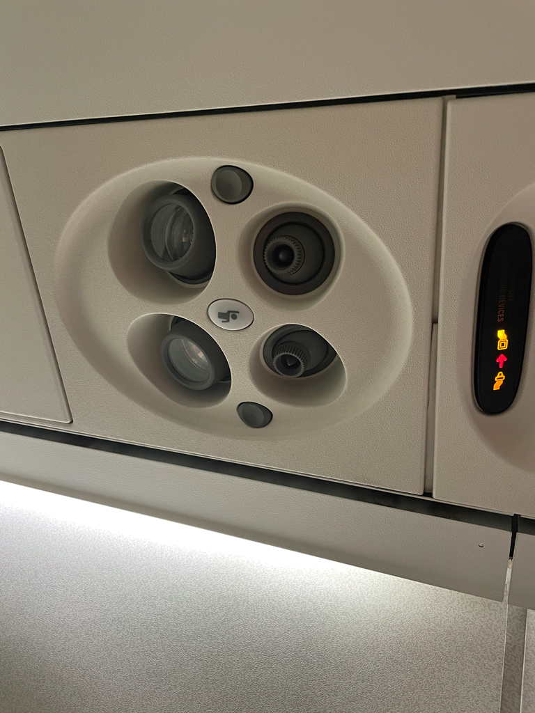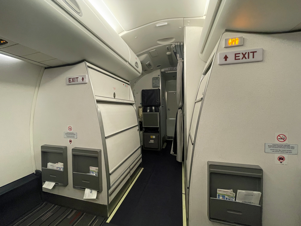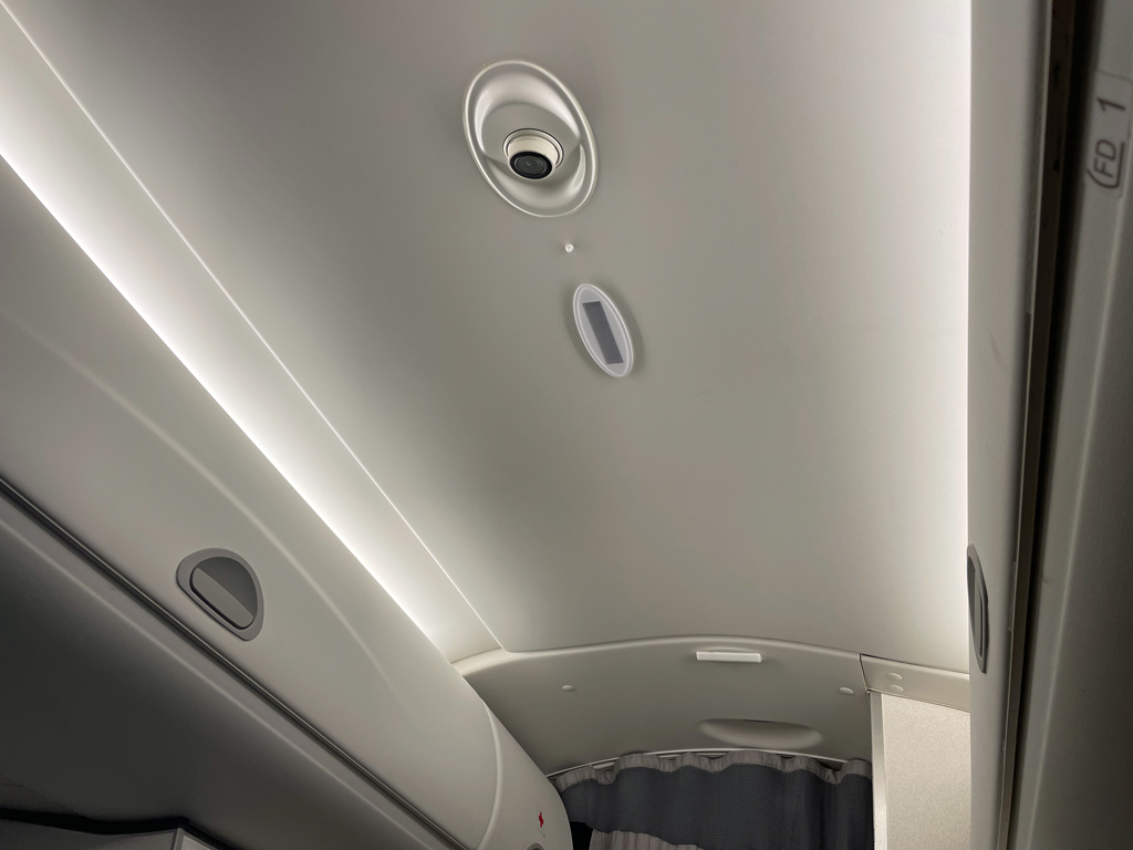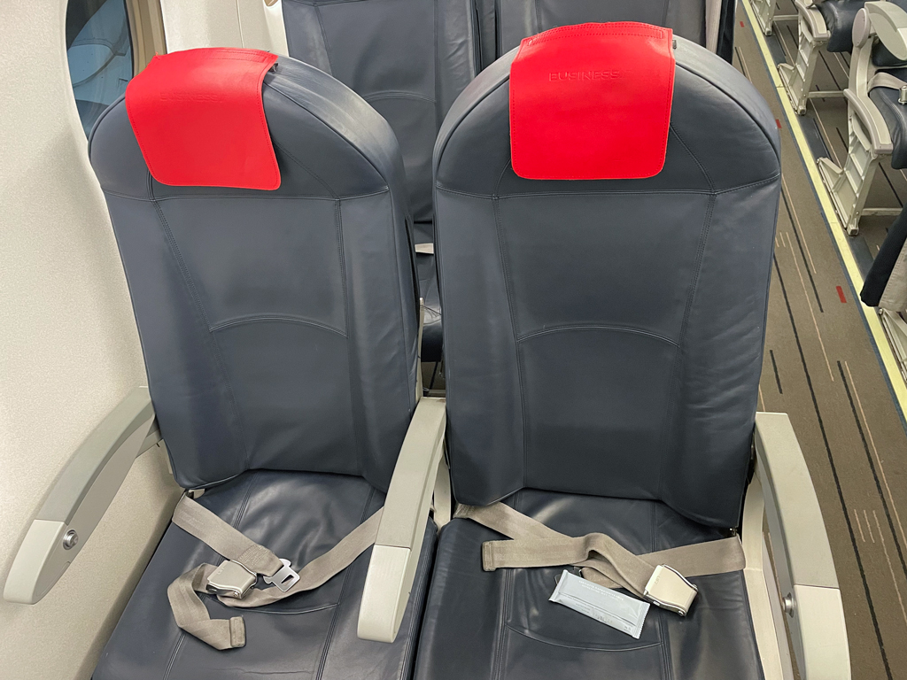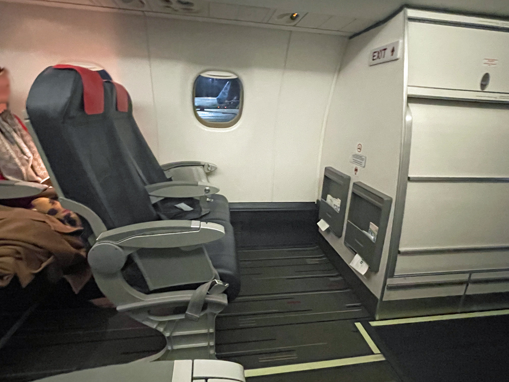 Das Boarding ging gefühlt recht zügig. In der abgetrennten Business Class nahmen vier Passagiere auf zwölf Sitzen Platz. Ich hatte die erste Reihe komplett für mich alleine. Nicht, dass es viel nützt, denn mit den Sitzen jenseits des Ganges kann man dann wenig anfangen. Aber der Eindruck der Weite macht doch etwas her.
