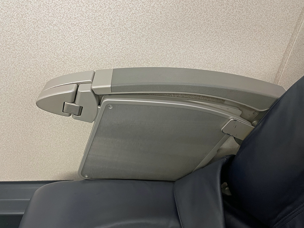 Die Tische befinden sich in den Armlehnen bzw. darunter. Wenn man die Armlehne hochklappt, kann man den Tisch herausziehen und vor den Sitz klappen. Wenn man sich die Konstruktion ansieht, bemerkt man, dass der Tisch nicht verkleidet ist, sondern einfach frei unter der Armlehne hängt. Anscheinend dient das der Gewichtsoptimierung.