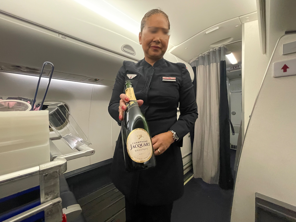 Nach dem Abräumen in der Kabine kam die Purserin zum Smalltalk auf Englisch zu mir. Sie fragte, ob ich wirklich genug Champagner getrunken hätte (Ob sie das philosophisch meinte?). Aber in Anbetracht meines Fluges am nächsten Tag war ich der Überzeugung, dass es wirklich genug gewesen sei.