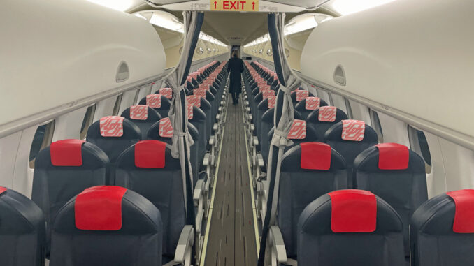 in der Embraer 190 hat HOP! 100 Sitze verbaut. Diese können flexibel zwischen Business Class und Economy Class verteilt werden. Da es in der Kabine mit Kabinengepäck und (Winter-) Jacken gerne einmal eng wird, sind bei Air France vorne zwischen Galley und Business Class zwei Schränke für Koffer verbaut.