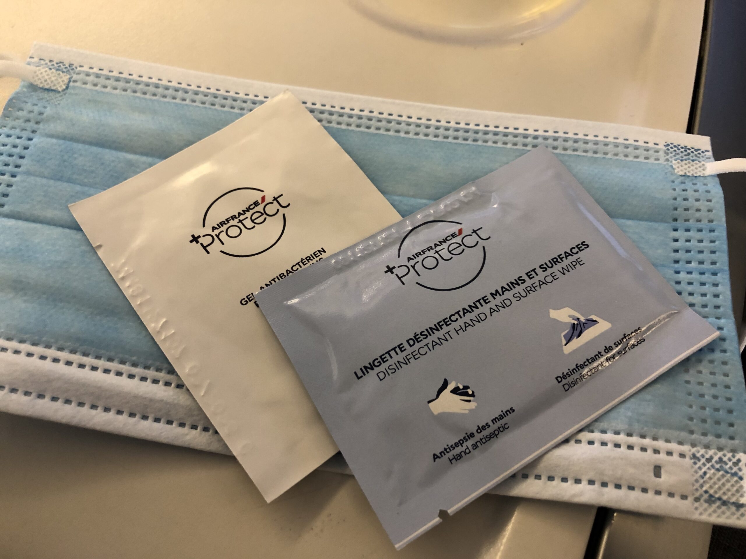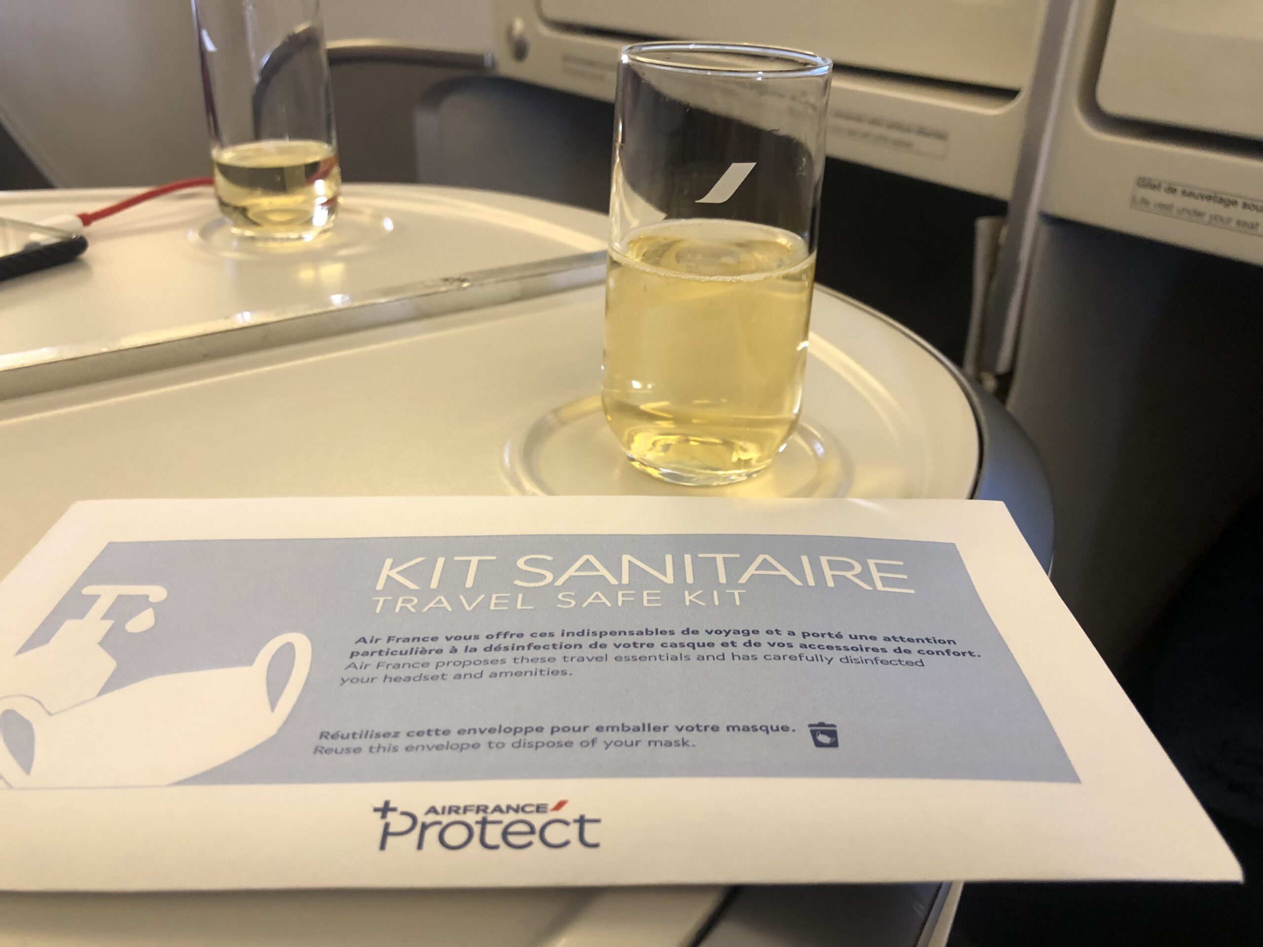 Die letzten Passagiere nahmen ihre Plätze ein und ein der erste Champagner fand dann den Weg zu uns. Anschliessend gab es noch Hygiene-Kits mit Maske und Desinfektion.