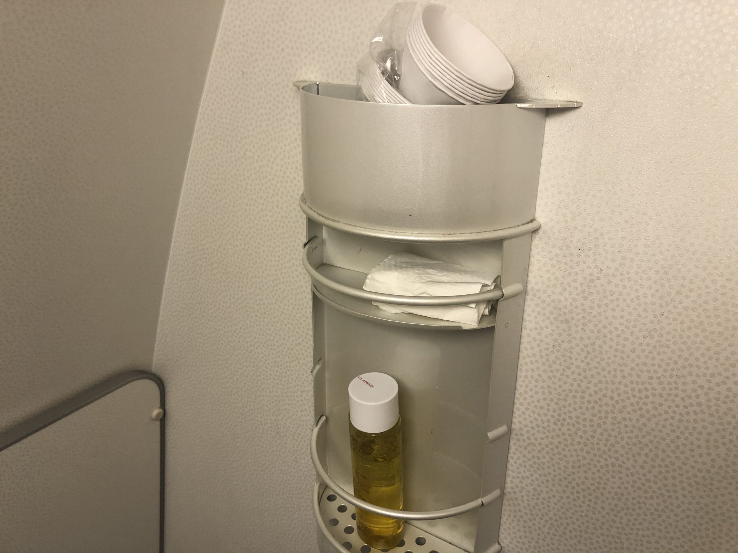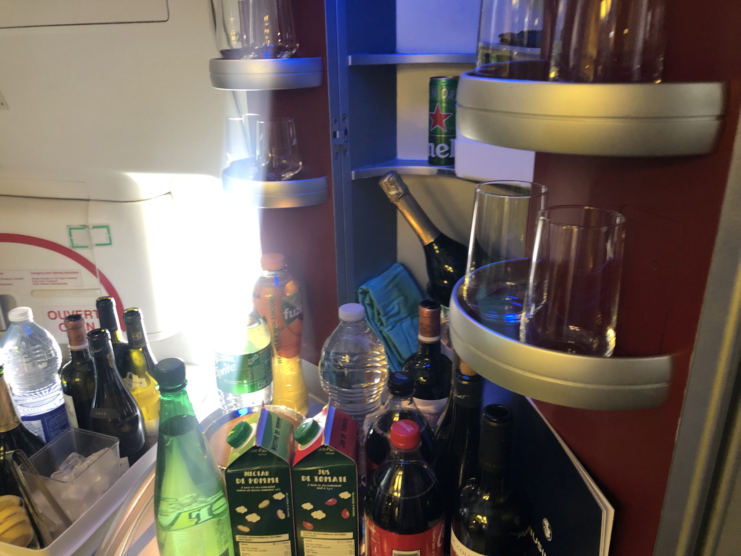 Auch während des Fluges waren die Flugbegleiter ansprechbar. Wer sich lieber selbst versorgen wollte, konnte sich Getränke und Snacks an einer Art Mini-Bar in der Galley bedienen.