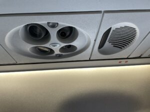 Was die kleine Embraer „auszeichnet“, sind die kleinen Aufbewahrungsfächer für Kabinengepäck. Aufgrund des geringen Durchmessers der „Flugzeugröhre“ kann es auch nicht anders sein, aber man sollte immer damit rechnen, Handgepäck und teilweise auch Jacken im Fußraum und/oder auf dem Schoß zu transportieren.