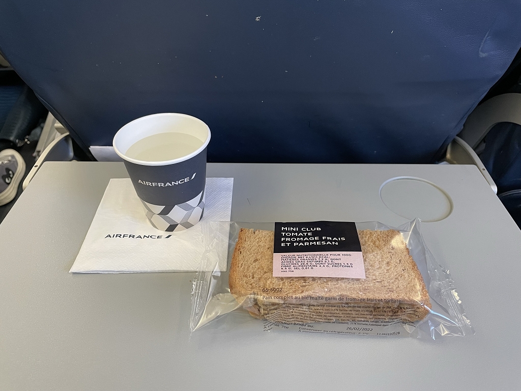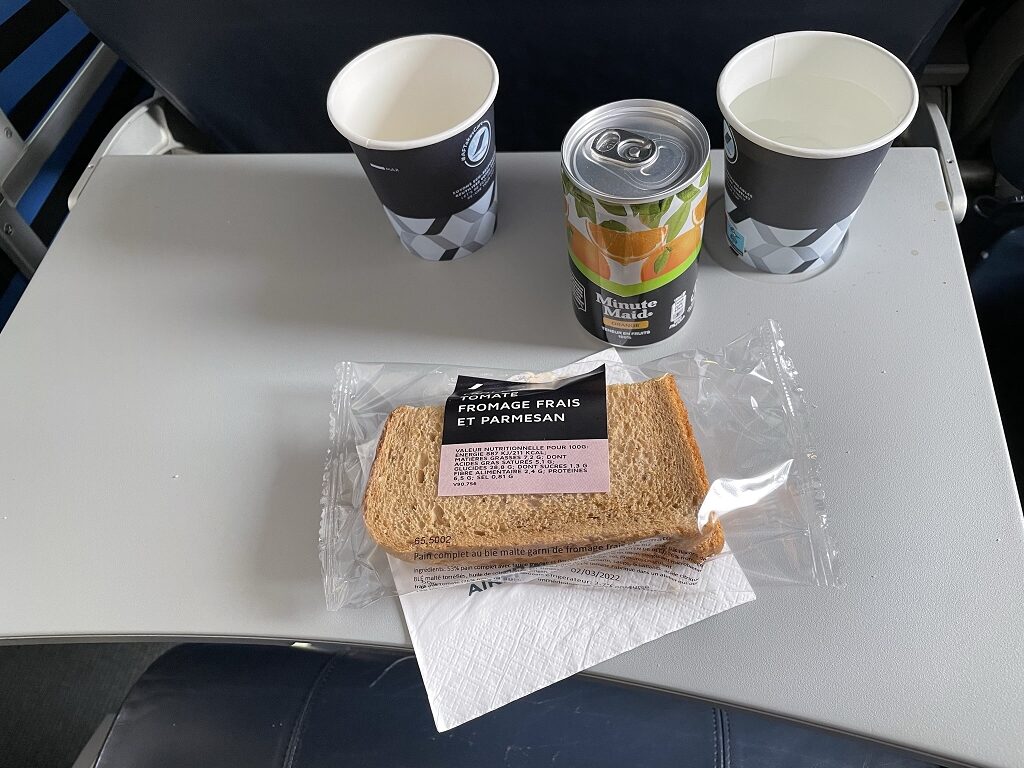 Obwohl HOP ja die Sparversion von Air France ist, gibt es auf der Strecke zwischen Frankfurt und Paris Verpflegung. Sie war auf beiden Flügen identisch und bestand aus einem Sandwich mit Tomaten-Mozzarella-Creme. Dazu gab es Wasser, Softdrinks und auch heiße Getränke (Kaffee, Tee) zur Auswahl. Für eine Flugzeit von 50 Minuten in der Economy Class wirklich gut.