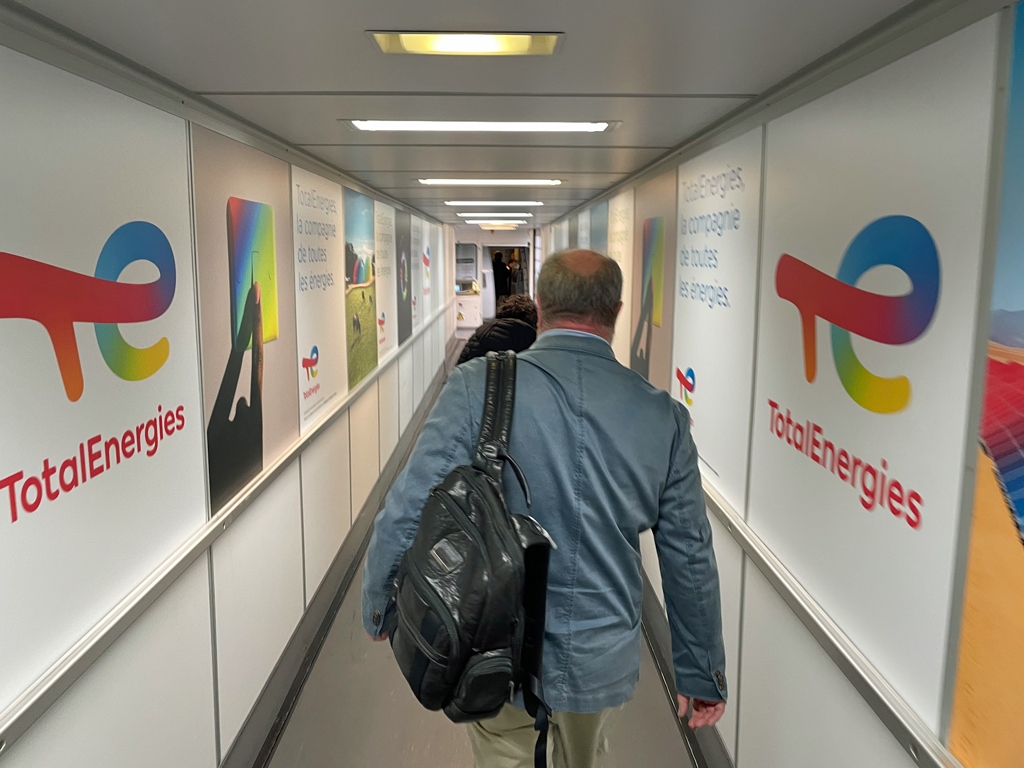 Beim Abschied aus dem Flugzeug wurden die Vorhänge zur Business Class geschlossen und vermutlich erst wieder geöffnet, als die Passagiere der La Premiere das Flugzeug verlassen hatten, denn trotz eines kurzen Stopps für Fotos vom Flugzeug wurde ich nicht von Passagieren aus der Business Class überholt.