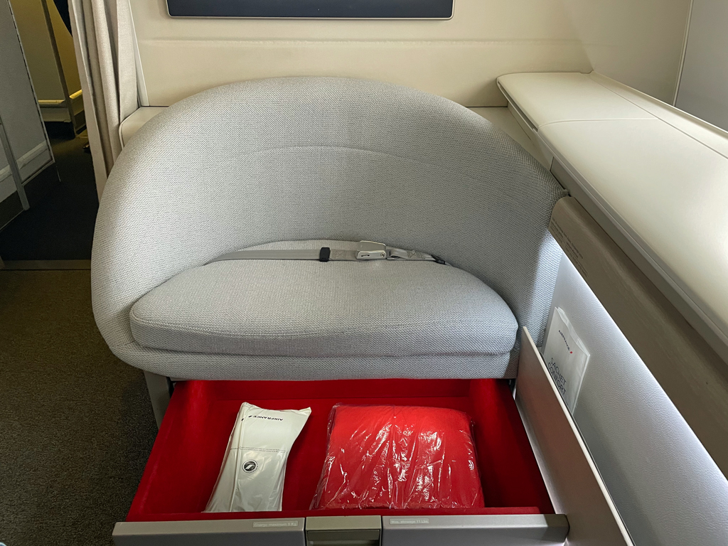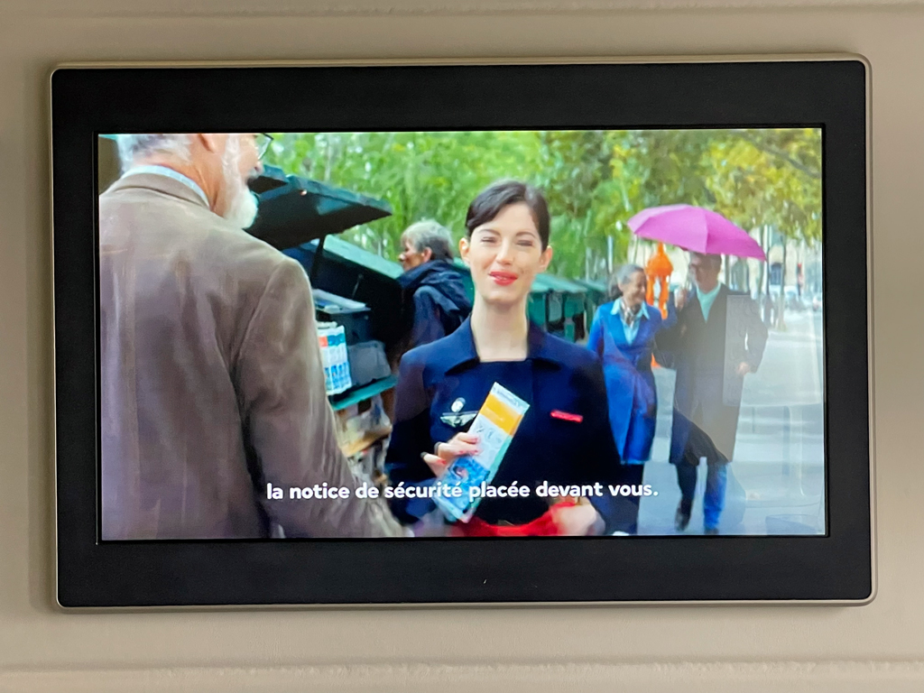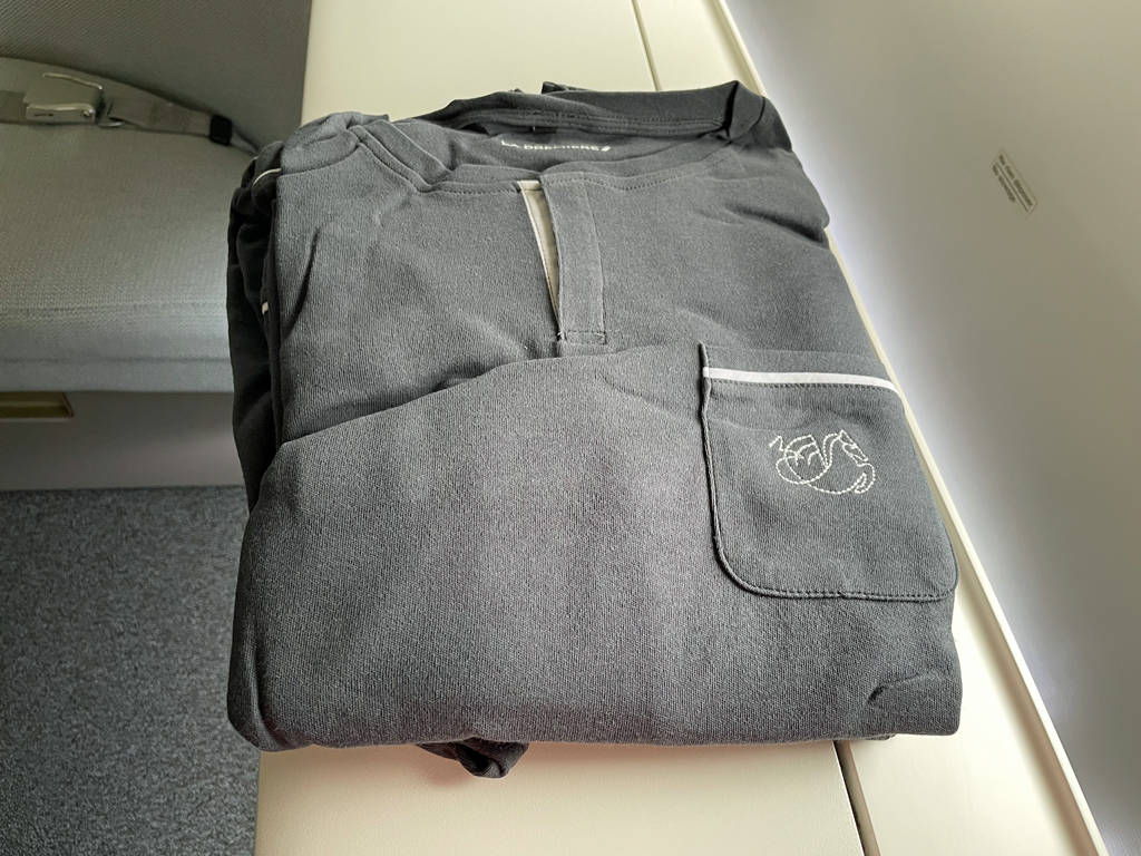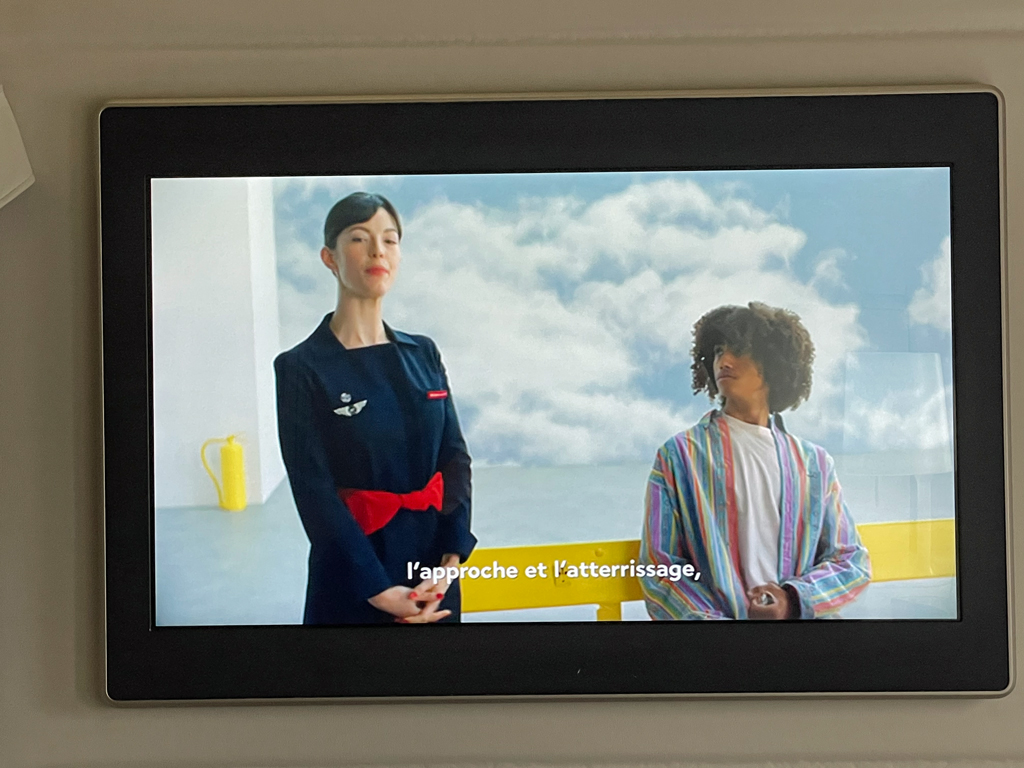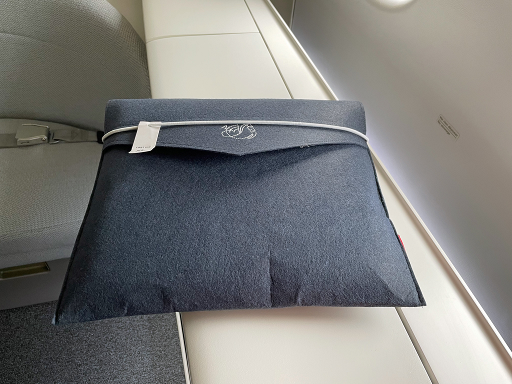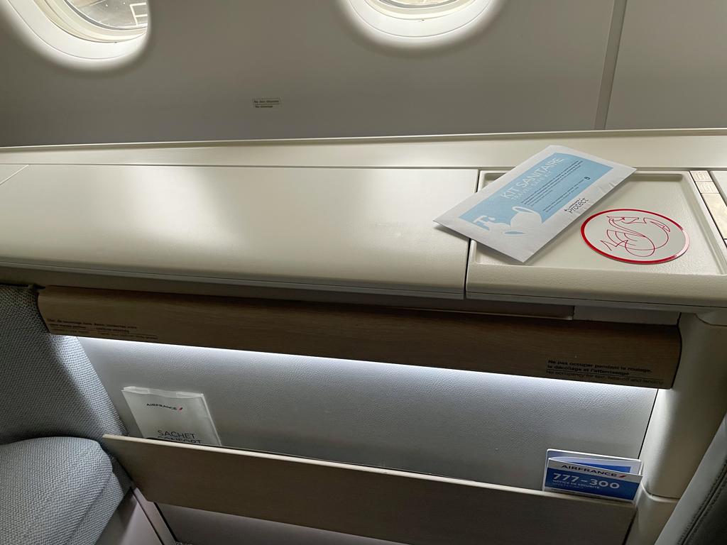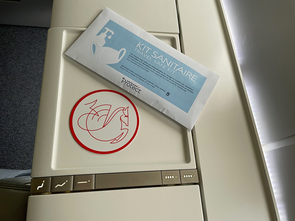Am Platz warteten bereits ein Kit Sanitaire (Maske, Desinfektionstuch und Desinfektionsgel), ein Untersetzer und ein Kissen (mit roten Seepferdchen). Eine Einweisung in den Sitz, dessen Funktionen usw. gab es nicht.