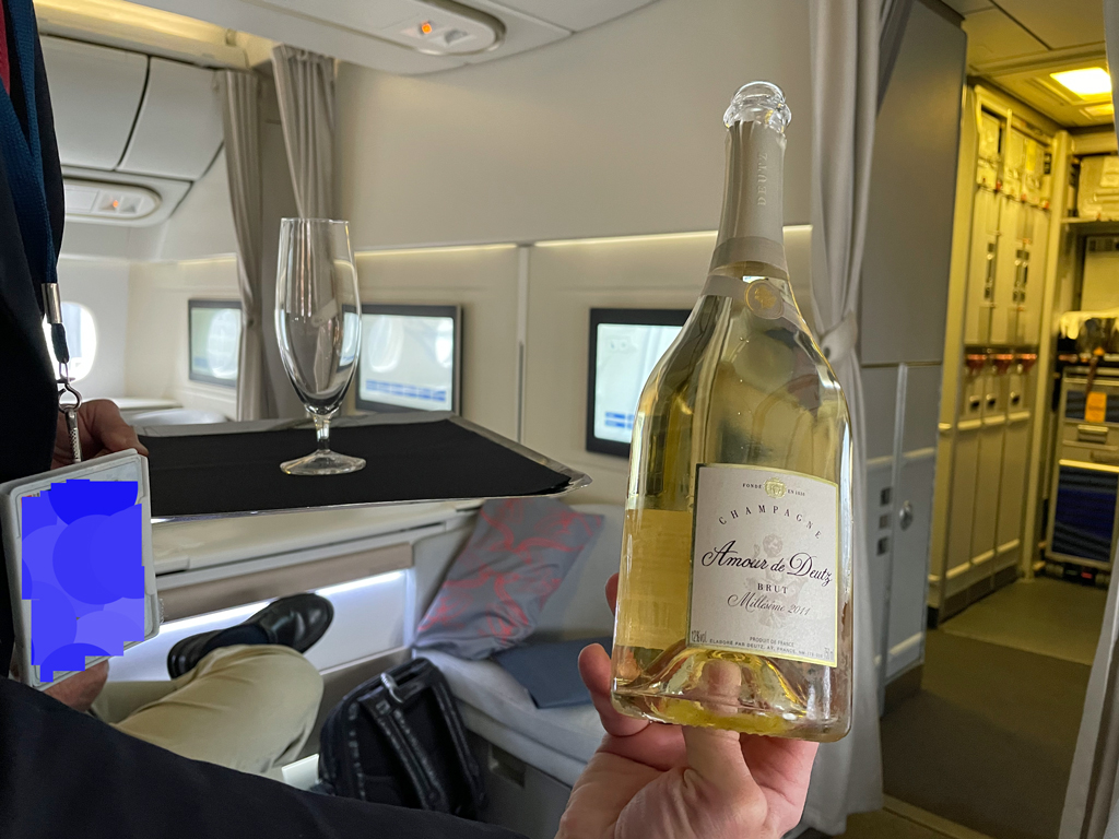 Das es nur einen vermeintlichen Top-Champagner gab, fand ich nicht toll, da er mir einfach nicht gut schmeckte, aber das ist nur ein persönliches Empfinden. Und überhaupt, die Menge an Alkohol, die Air France in der First Class ausschenkt. Die Crew füllt die Gläser gerne bis fast zum Rand und bietet auch gerne ein paar zusätzliche Schlücke an. Da darf man keine Scheu haben, (halb)volle Gläser zurückzugeben. Sonst gerät da schnell etwas aus den Fugen.