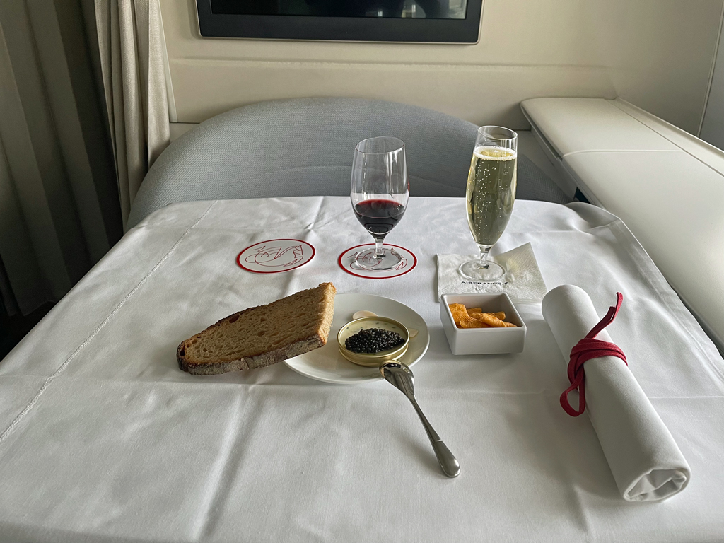 Zum Champagner wurden Gavottes gereicht. Das sind in diesem Fall kleine gefüllte Waffelecken. Die als Snack ganz gut schmecken, aber überhaupt nicht passten. Weder zum Champagner, noch zum Kaviar, der in rascher Folge gereicht wurde. Das lag nicht unbedingt am Kaviar selbst, sondern an der Tatsache, dass er bei Air France auf einer Kaperncreme gereicht wurde. Auf das Mismatch angesprochen entschuldigte sich der Flugbegleiter bei mir. Er würde die Waffeln nur ungern zum Champagner und Kaviar servieren, aber es sei nunmal so vorgesehen.