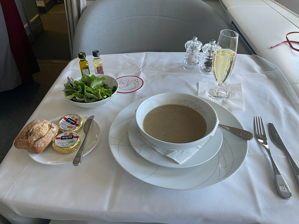 Die Suppe wurde serviert und mir wurde dazu ein Weißwein empfohlen. Den Portwein hatte ich inzwischen zurückgegeben und das Champagnerglas war noch fast voll, aber das hielt den Flugbegleiter nicht ab.