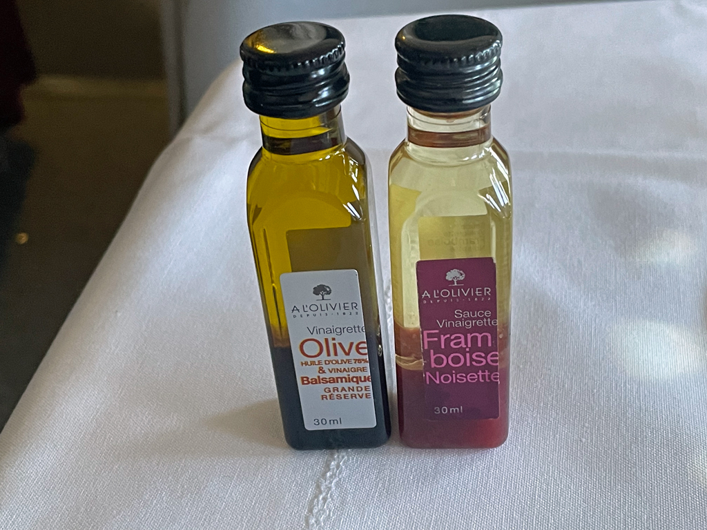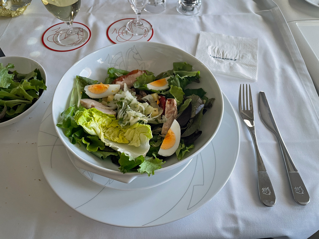 Zu der Suppe gab es einen grünen Salat in einem kleinen Schälchen. Nachfolgend gab es den „großen“ Salat. Hier stellt Air France eine Liste möglicher Zutaten zur Verfügung und man kann selbst bestimmen, welche auf dem Teller landen. Ein sehr gutes Konzept. Leider hatte ich vergessen, das Geflügelfleisch abzubestellen. Dadurch wurde der Salat reichhaltiger als beabsichtigt, denn erst danach folgten Jakobsmuscheln als Vorspeise. Zu den Jakobsmuscheln wurde mir wieder Champagner empfohlen. Diesmal ein Duval Leroy aus der Business Class. Der schmeckte nicht schlecht, aber ich nahm das Glas eher pro Forma an.