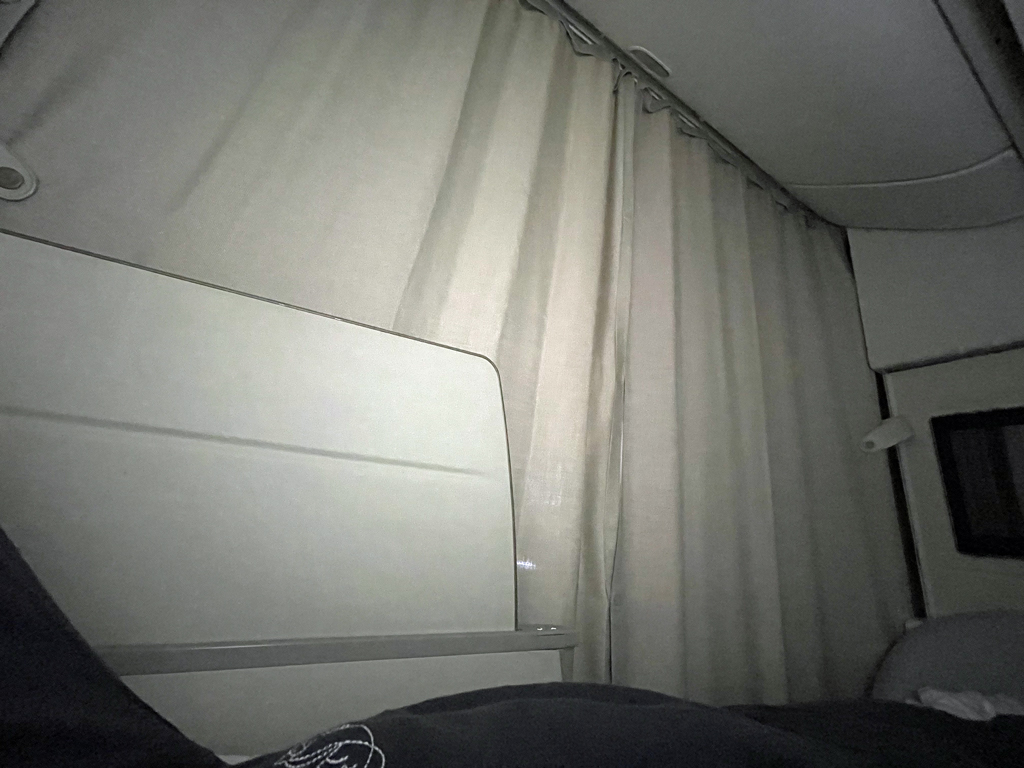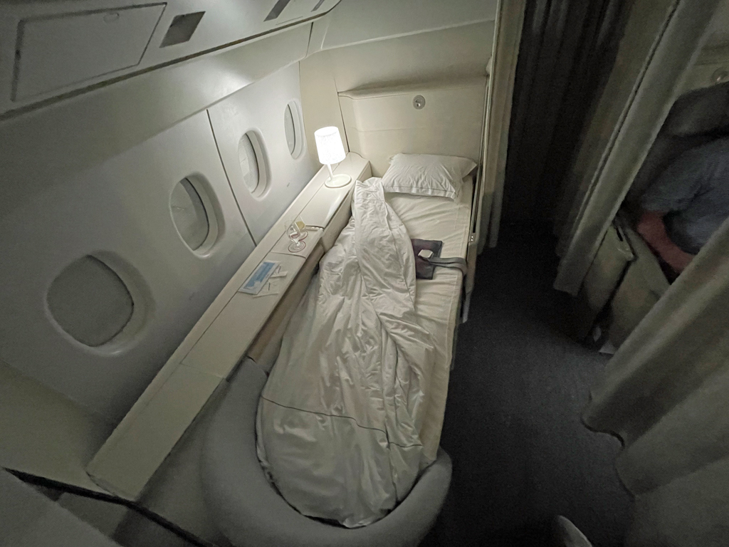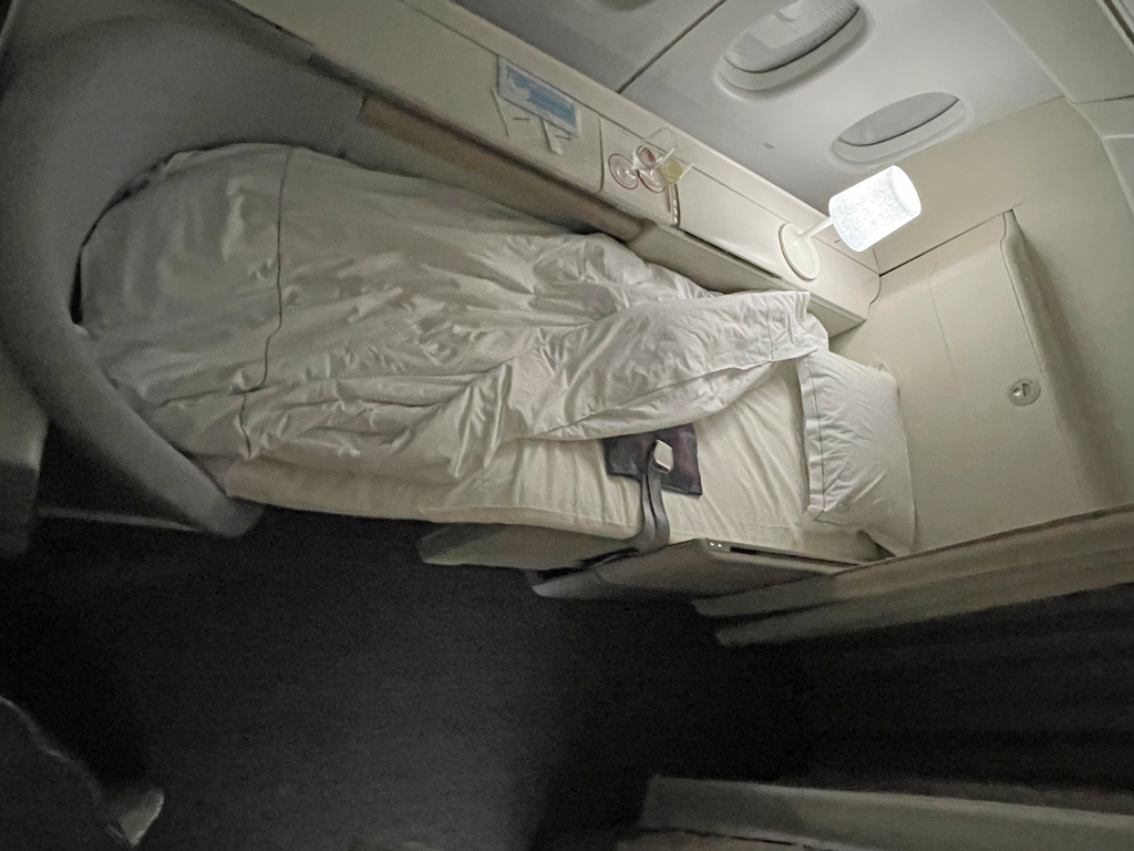 Nach dem ersten Essen bat ich darum, das Bett zu bereiten, da ich ein paar Stunden schlafen wollte. Der frühe Start in den Tag und das viele Essen hatten mich müde gemacht. Während ich in der Toilette Zähne putzte wurde das Bett makellos vorbereitet. Dazu wird auf den Sitz in Liegeposition noch eine Matratze gelegt. Außerdem warteten eine kuschelige Bettdecke und ein frisches Kopfkissen auf mich. Sobald ich mich ins Bett gelegt hatte wurde ich gefragt, ob ich ein paar Wasserflaschen am Bett haben möchte. Sie wurden flugs gebracht und dann wurden die Vorhänge geschlossen.