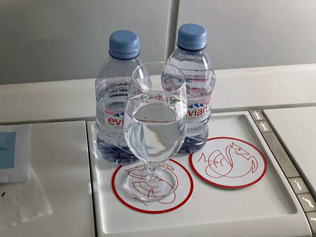 Ich hatte kaum Zeit, die Inhalte des Amenity Kits zu fotografieren, bis die Getränke gebracht wurden. Nüsse oder einen Snack gab es nicht. Während der Fahrt zur Startbahn wurde das leere Champagnerglas abgeholt. Das Wasserglas durfte ich behalten, wurde aber gebeten, es beim Start festzuhalten.