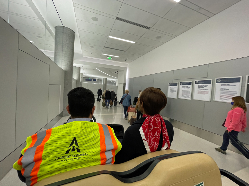 Nach der Landung wurde ich von einer Air France Angestellten „übernommen“. Sie brachte mich zu einem Cart und mit diesem ging es in Windeseile zur Immigration. Der Länge der Schlange nach zu urteilen, hätte ich dort sicherlich 60-90 Minuten angestanden. Aber nicht so mit der Begleiterin von Air France. Es gibt zwar keine gesonderten Einreiseschalter für First Class Passagiere, aber die Dame machte sich mit ihrer Uniform und dem ausgestreckten LAX-Pass in der Hand sehr gut als Wellenbrecher. Sie lotste mich so schnell sie konnte durch die Schlange und nach kaum 20 Minuten war die Einreiseprozedur absolviert. Erst dann fragte sie mich, wo sie mich denn hinbringen dürfe. Mit der Antwort „Terminal 6 United Airlines“ hat sie zwar nicht gerechnet, aber sie nahm es sportlich und begleitete mich den gesamten Weg bis zum Gate im anderen Terminal. Immerhin ein Fußweg von über 20 Minuten.
