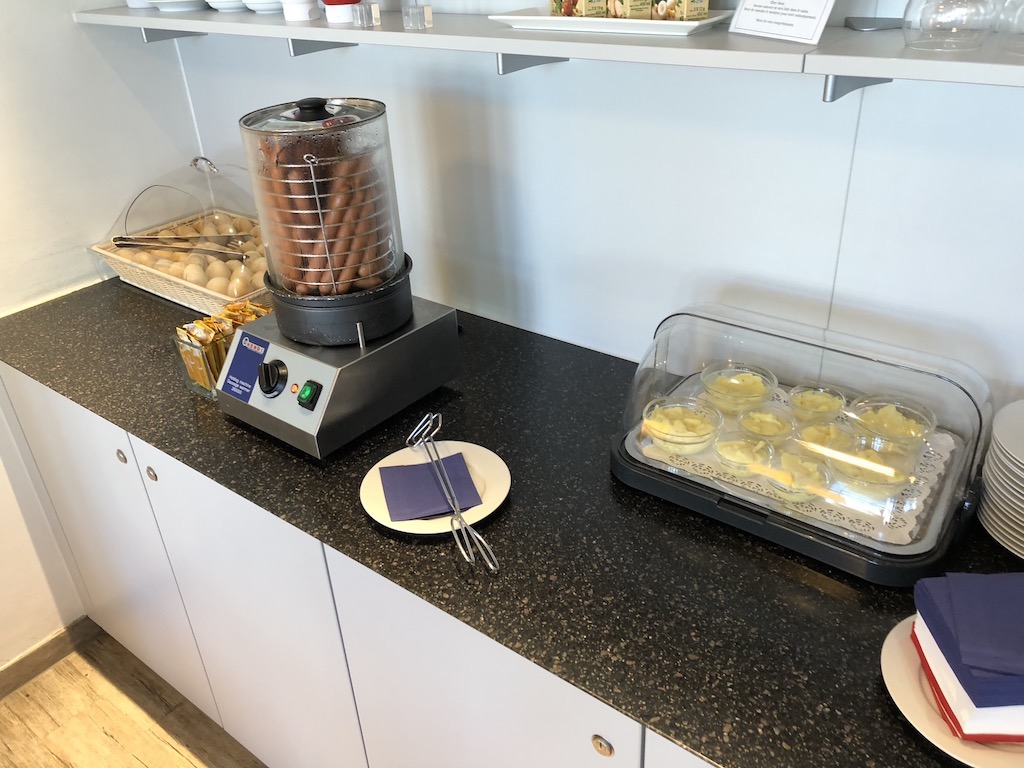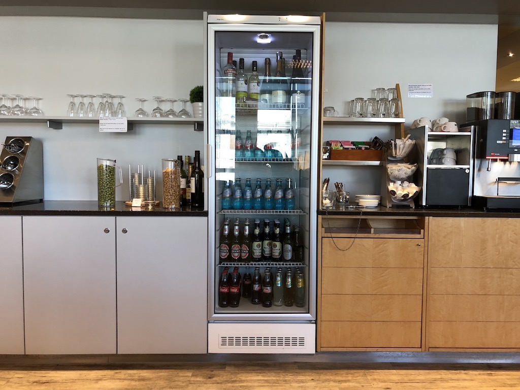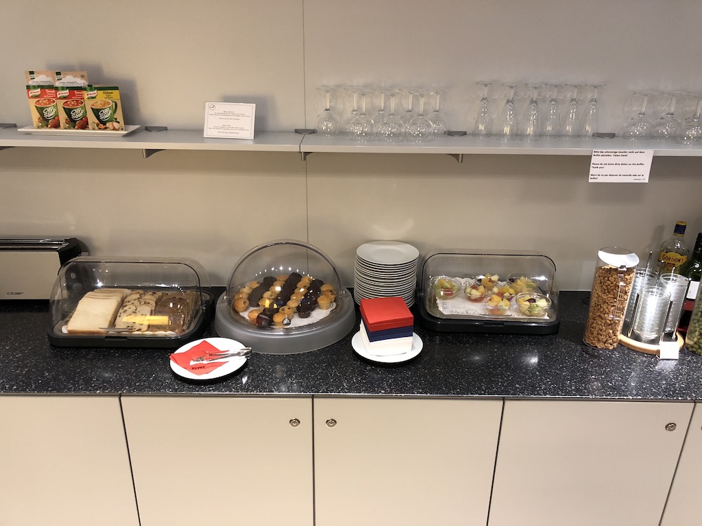 Zentral in der Lounge befindet sich in einer L-Form das Buffet, welches die übliche Auswahl an Softdrinks (Wasser, Coca-Cola regulär, light, zero, Schweppes Ginger Ale, Schweppes Tonic Water und Schweppes Bitter Lemon), Säften, Wein, Bier (Becks Pilsner, Paulaner Hefeweizen, Heineken Pilsner, Jever Fun alkoholfrei), Spirituosen (u.a. Gordons Gin, Jim Beam Bourbon, Henessy Weinbrand, Ballantines Scotch), und Kaffee- und Teespezialitäten bietet. Champagner wird nicht angeboten, jedoch ein ordentlicher Crémant von Bouvet. Ganztägig bietet die Lounge eine Auswahl an Obst, Schokoriegeln, Nüssen, Bifis und Keksen. Zusätzlich ist es möglich am Morgen ein Frühstück bestehend aus Brötchen, Laugenbrezeln, Croissants, sowie diversen Aufstrichen, Wurst und Käse einzunehmen. Cerealien, Jogurt, Obstsalat und weitere Frühstücksbasics standen ebenfalls zur Verfügung.