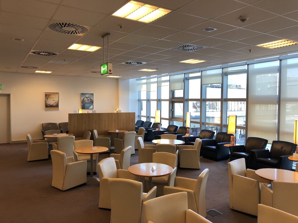 Entlang einer großen Glasfassade, welche leider nicht aufs Vorfeld, sondern zu einem Liefereingang des Flughafens zeigt, befinden sich neben weiteren Sesseln auch große Tische mit passenden Sitzgelegenheiten, die insbesondere zum Essen und Arbeiten geeignet sind.