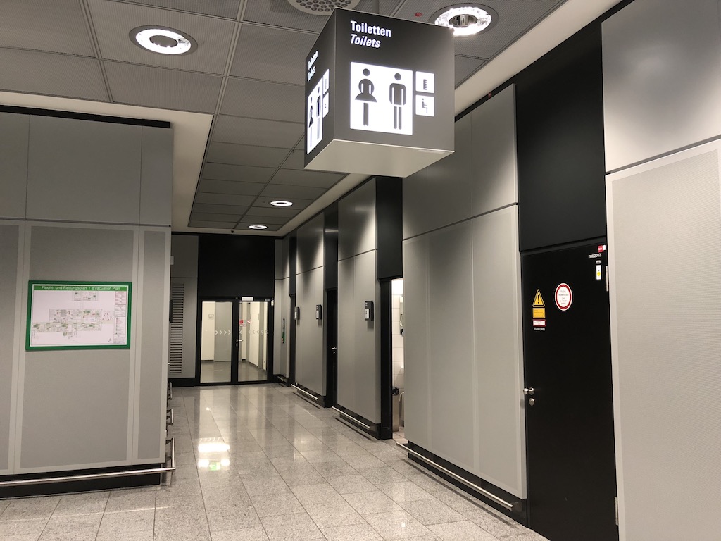 Steckdosen befinden sich teils etwas provisorisch unter Bodenklappen und teilweise entlang der seitlichen Tische der Loungemöbel. Das WiFi funktionierte bei allen meinen Besuchen bisher einwandfrei. Ein kleines abgegrenztes Business Center existiert ebenfalls mit Tischen und Bürostühlen. Toiletten befinden sich nicht innerhalb der Lounge und sind, die Lounge nach rechts verlassend eine kleine Treppe hinab, in ca. 30 Metern Entfernung zu finden.