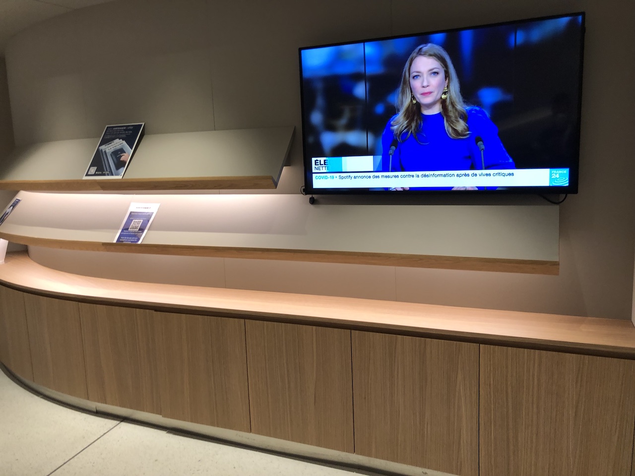 Auf Zeitschriften und Zeitungen muss man (noch) verzichten, in der Lounge sind mehrere Bildschirme auf denen Nachrichten und Fluginformationen zu sehen sind.