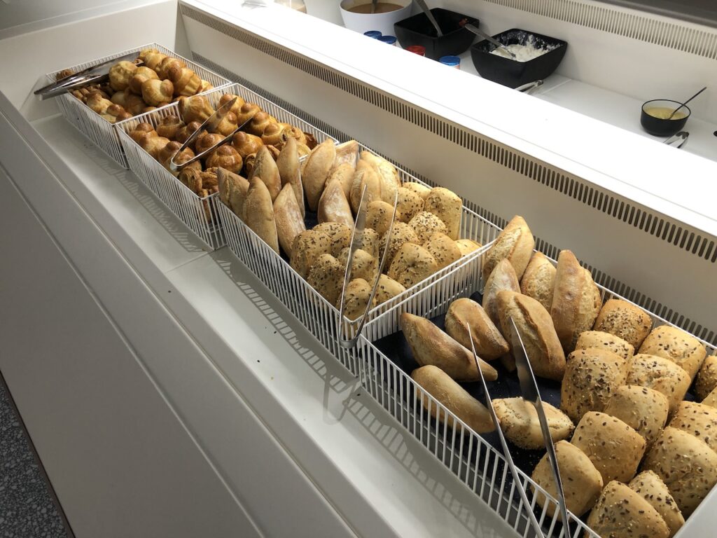 Der Fokus war morgens um 9 Uhr voll auf Frühstück. An mehreren Stationen konnte man sich selbst bedienen und mit Croissants, Brot, Aufschnitt oder Obst versorgen. Auch warme Optionen wie Rührei sind morgens dabei.