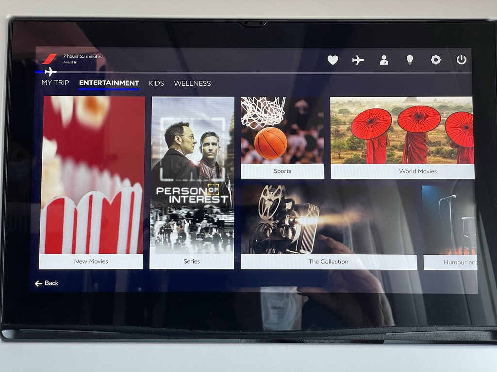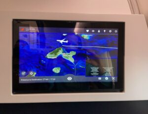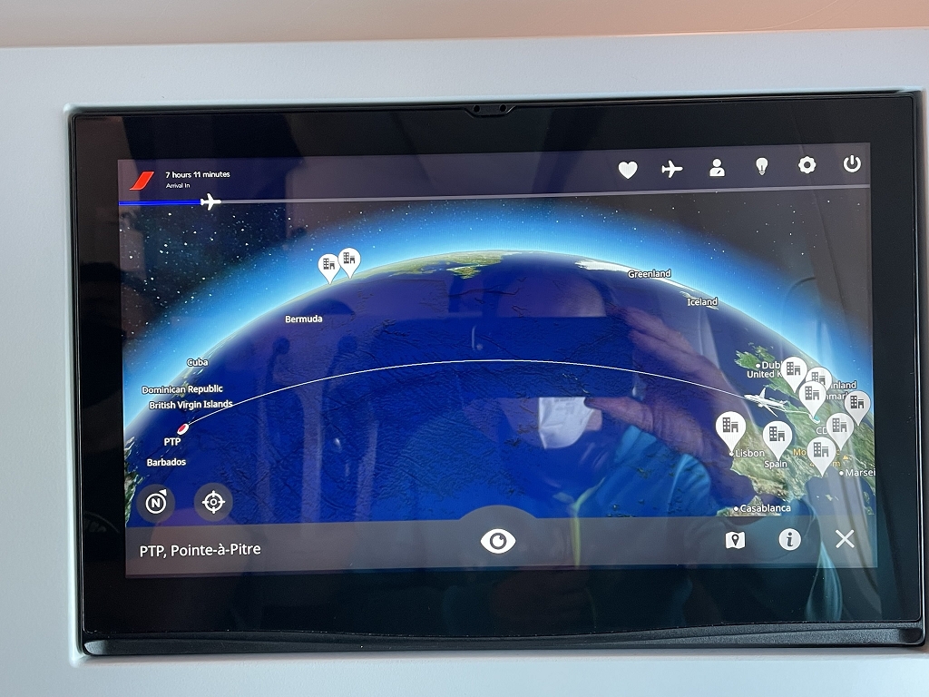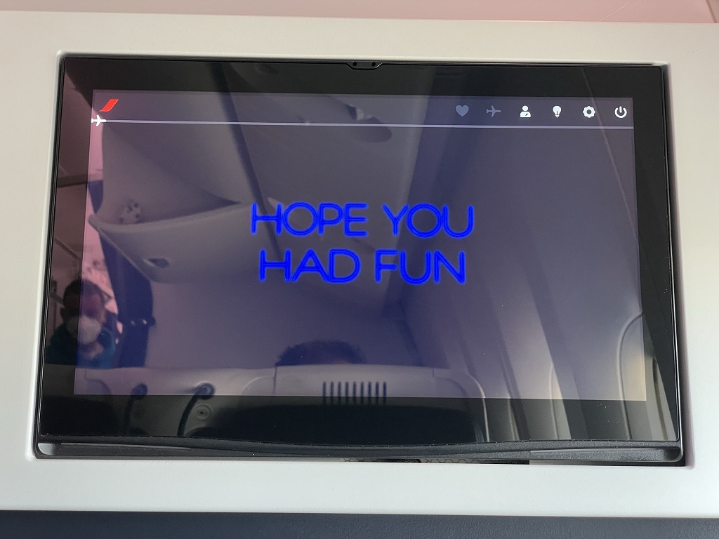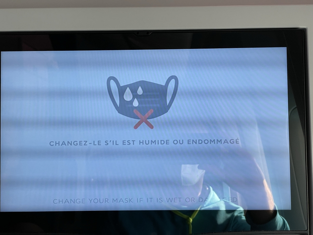 Bevor man jedoch das Entertainment System nach eigenem Geschmack nutzen darf, gibt es erst ein Sicherheitsvideo. Gesprochen wird abwechselnd auf Französisch und Englisch, wobei zweitere Sprache mit einem deutlichen französischen Akzent intoniert wird. Im Anschluss an das Sicherheitsvideo folgt noch ein Video zur korrekten Maskennutzung und -entsorgung. Während des Flugs gab es mehrere Ansagen, dass Masken wieder aufzusetzen seien.