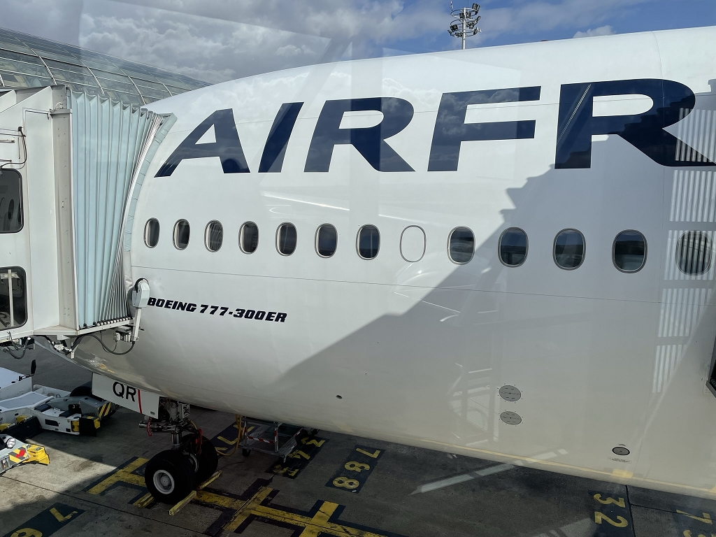 Flugzeug: Boeing 777-300ER F-GSQR (Die „Karibikkonfiguration“ mit kleinerer Business Class wird bei Air France nur 777-300 genannt, obwohl es sich um 777-300ER Flugzeuge handelt.)