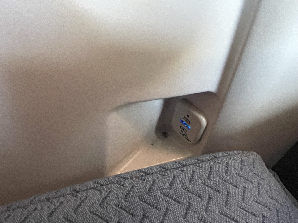 Etwas weiter unten an der Armlehne befindet sich ein USB-Port zum Laden von elektronischen Geräten. Während des Starts und der Landung ist das allerdings nicht erlaubt.