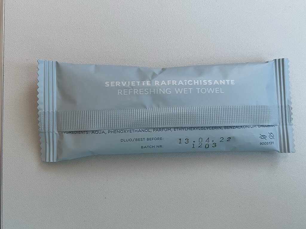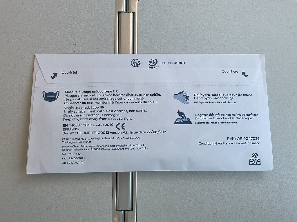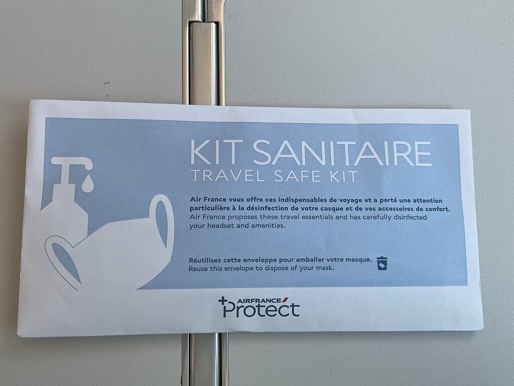 Vor Abflug wurden noch schnell die Kits Sanitaire, also kleine Briefchen mit OP-Maske und Desinfektionsgel verteilt. Dazu gab es noch ein eingeschweißtes feuchtes Tuch. Ein netter Touch.