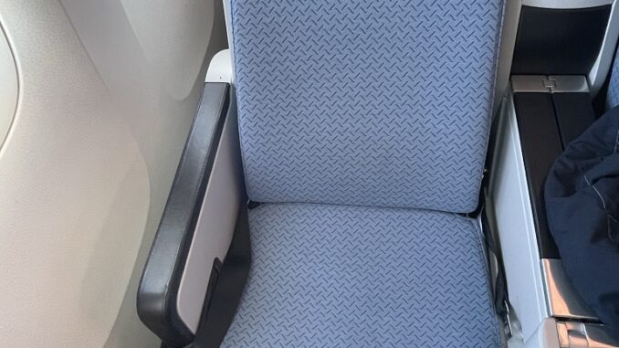 Die Sitze sind richtige Brocken. Durch die Schale, in der sich die Sitze befinden, wirkt die Kabine reihenweise in Abschnitte getrennt, denn zwischen den Sitzen ist eine Blende angebracht, so dass ein vollständiger Sichtschutz besteht. Die Sitze sind in hellem Blau mit einer dunkelblauen Kopfstütze gehalten. Alle bieten eine ausfahrbare Beinstütze, die sich jedoch nur für kleine Menschen lohnt.