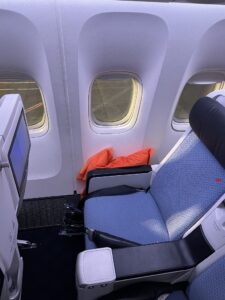 Auf den Sitzen lagen Kissen und eingeschweißte Decken. Kleine Wasserflaschen am Platz gehörten ebenfalls zur Grundausstattung. Leider habe ich dann einen Blick in die Sitztasche geworfen – sie war sehr dreckig.