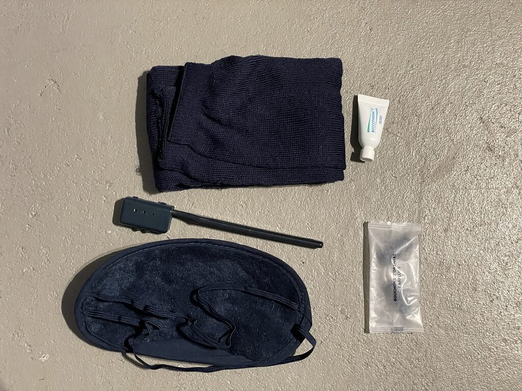 In der Premium Economy verteilt Air France ein unisex Amenity Kit. Die Artikel stecken in einem kleinen dunkelblauen Etui. Enthalten ist eine Klappbürste, eine Zahnbürste mit Zahnpasta und ein paar Socken. Qualitativ sind die Produkte sicherlich kein Renner, aber insgesamt können sie helfen, das Flugerlebis aufzuwerten. Im Vergleich gefällt mir das Amenity Kit in der Premium Economy von Lufthansa besser, da dort brauchbare Pflegeprodukte enthalten sind.