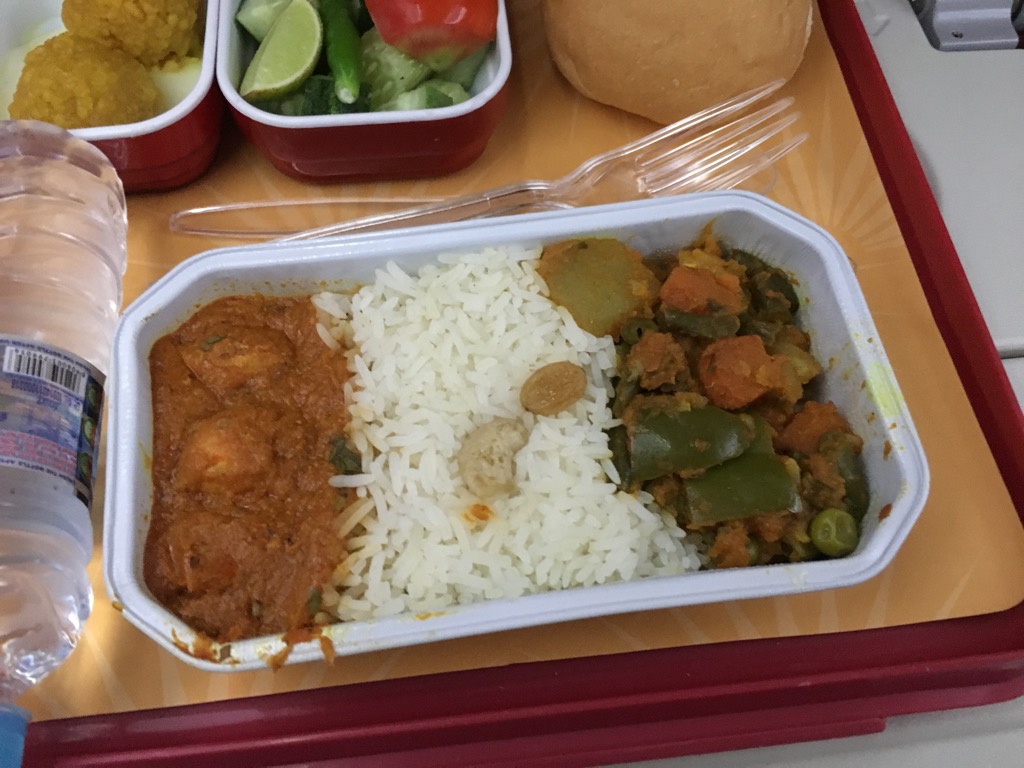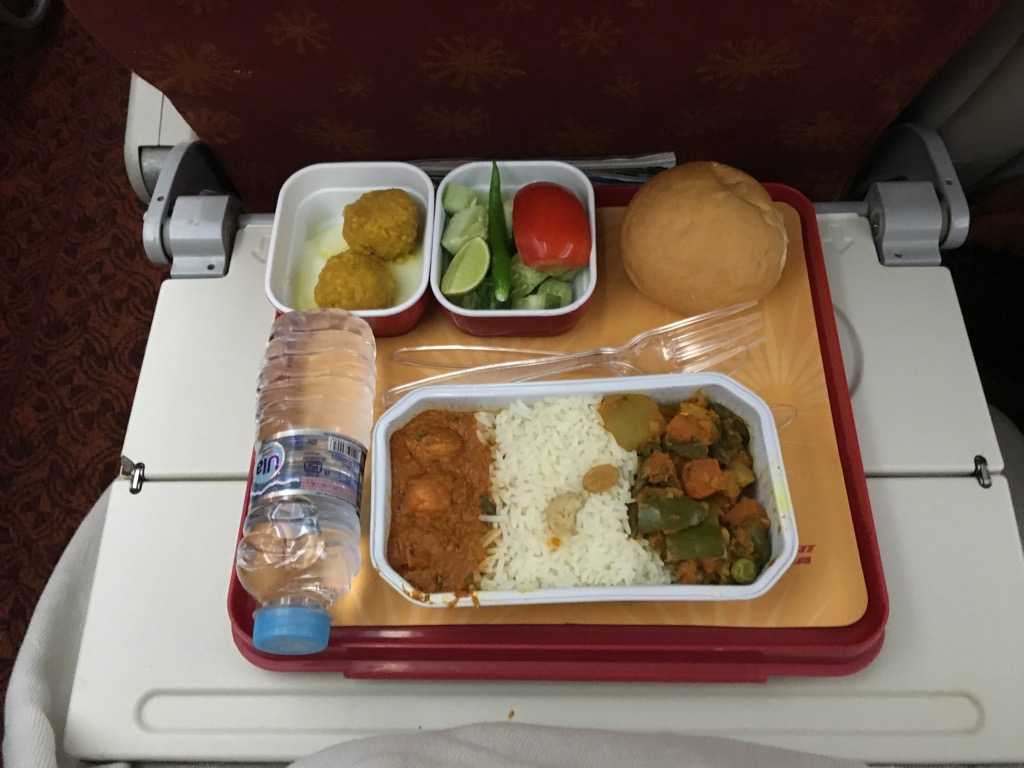 Nach dem Aperitif wurde der Hauptgang serviert. Dabei hat man in der Air India Economy Class die Auswahl aus vegetarischem- und nicht vegetarischen indischen Essen. Ich selbst bin kein Fan von indischem Essen, zumindest wenn es nicht sehr gut ist, allerdings war das servierte Essen völlig in Ordnung.