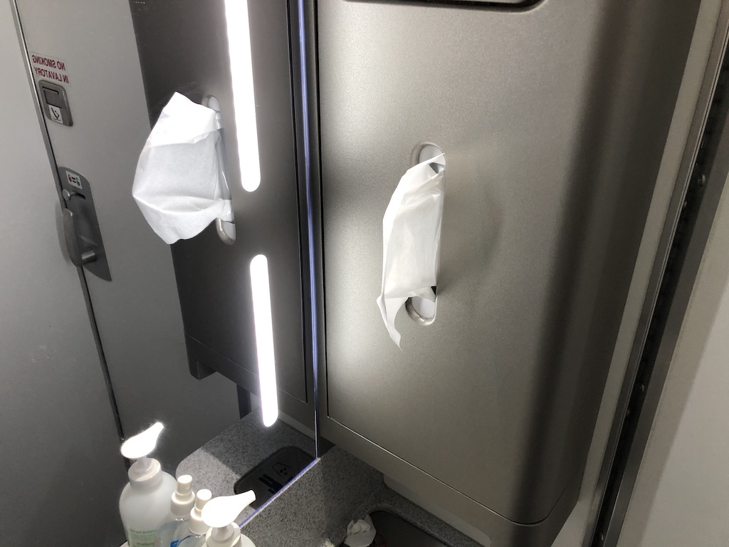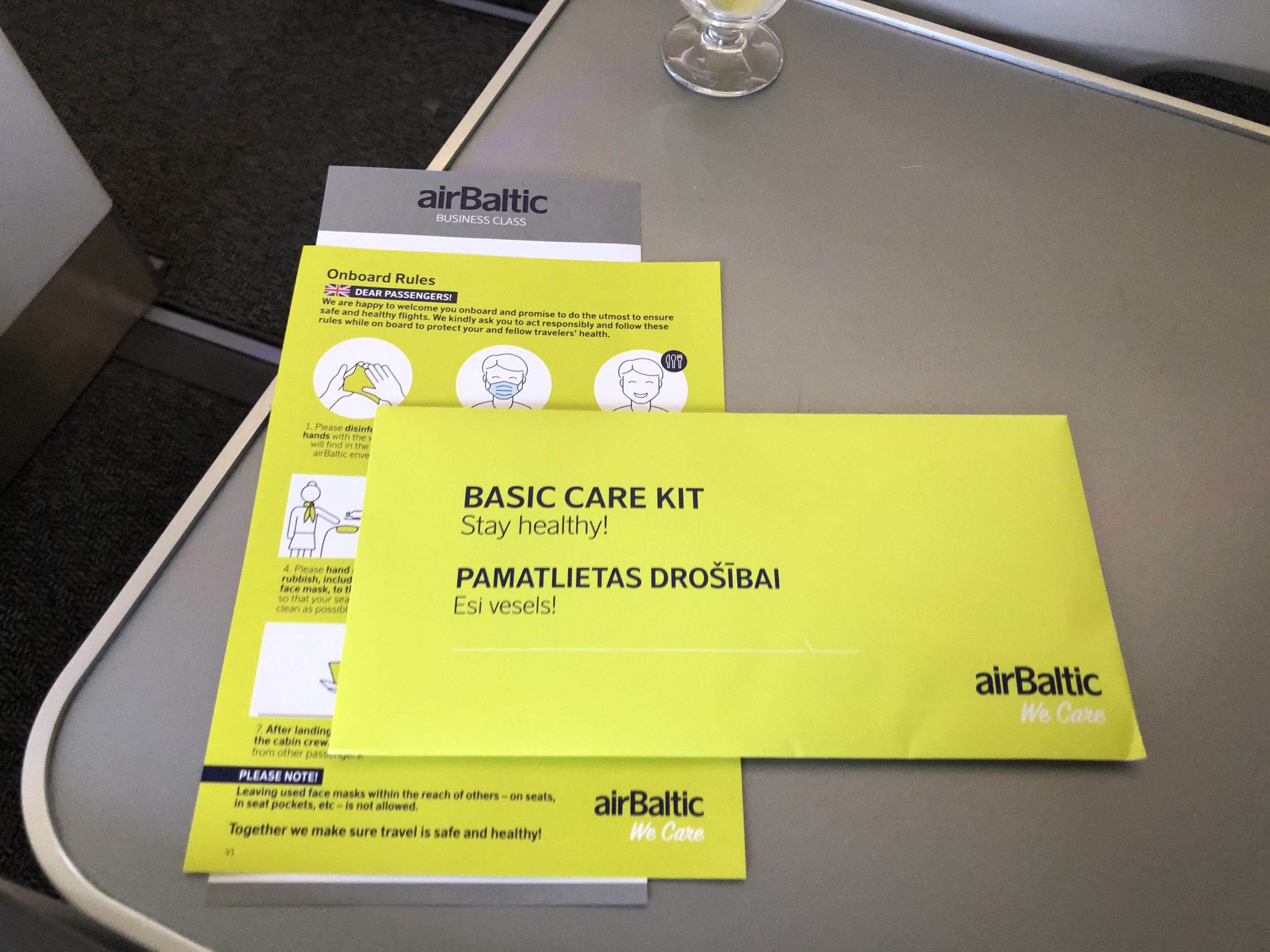 Nach dem warmen Empfang der Flugbegleiterin wurden mir das Bordmagazin und eine Getränkekarte überreicht. Das Magazin ist zur Zeit nicht ausgesteckt, wird aber allen Gästen nach Wunsch ausgehändigt. Beim Boarding erhält jeder Passagier einen Umschlag mit Maske und Desinfektionstüchern. Zusätzlich dazu gibt es einige Hinweise und Verhaltensregeln.